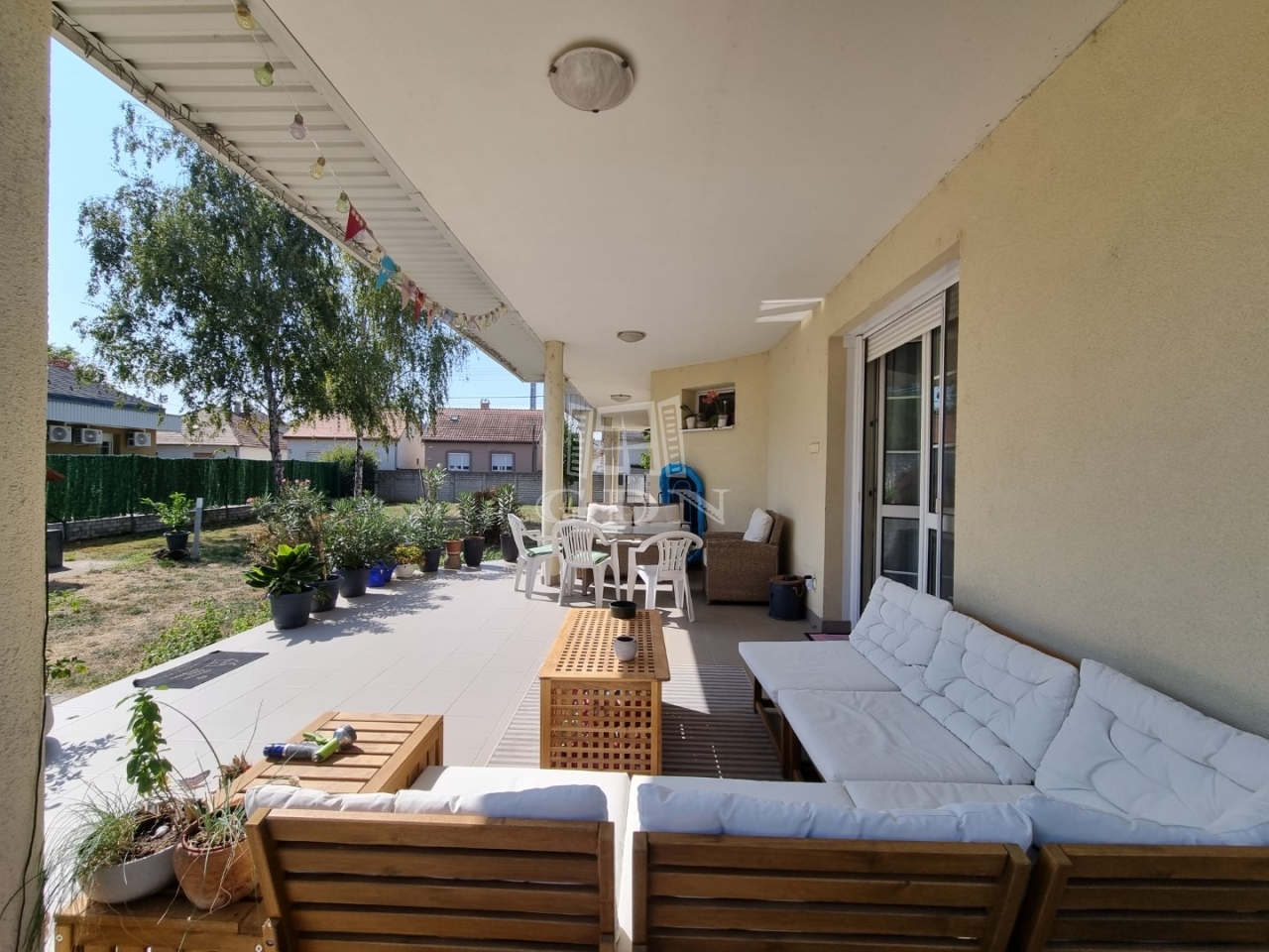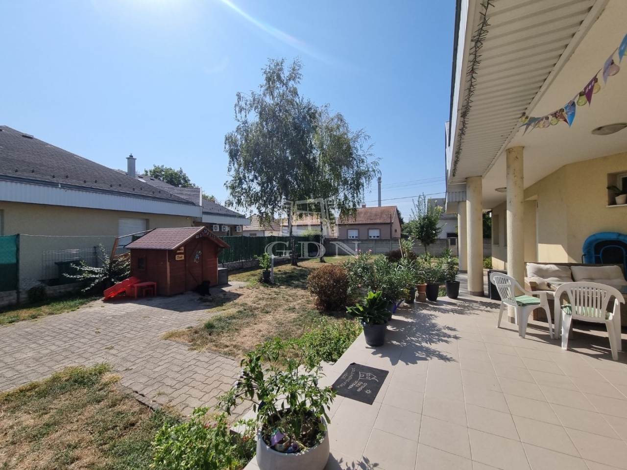 Az utcai kapu elektromosan nyitható, az udvar térkövezett, parkosított. Itt található egy, egy fedett terasz illetve a kertben egy tároló. A kertben kerti kiülő, gyümölcsfa, örökzöld megtalálható. Tehermentes, azonnal költözhető.