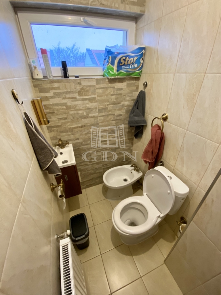 A földszinten egy világos, kertkapcsolatos konyha–étkező fogadja az érkezőket, amely közvetlenül kapcsolódik a nagy méretű nappalihoz – ez a tér a családi élet természetes központjává válik. Itt kapott helyet a sarokkáddal felszerelt fürdőszoba is, valamint egy külön helyiségben kialakított WC és bidé.