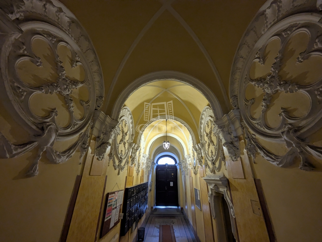 Az előtéren maszkos pilaszterek és stukkók díszítik a falakat, a lefedés keresztboltozatos.