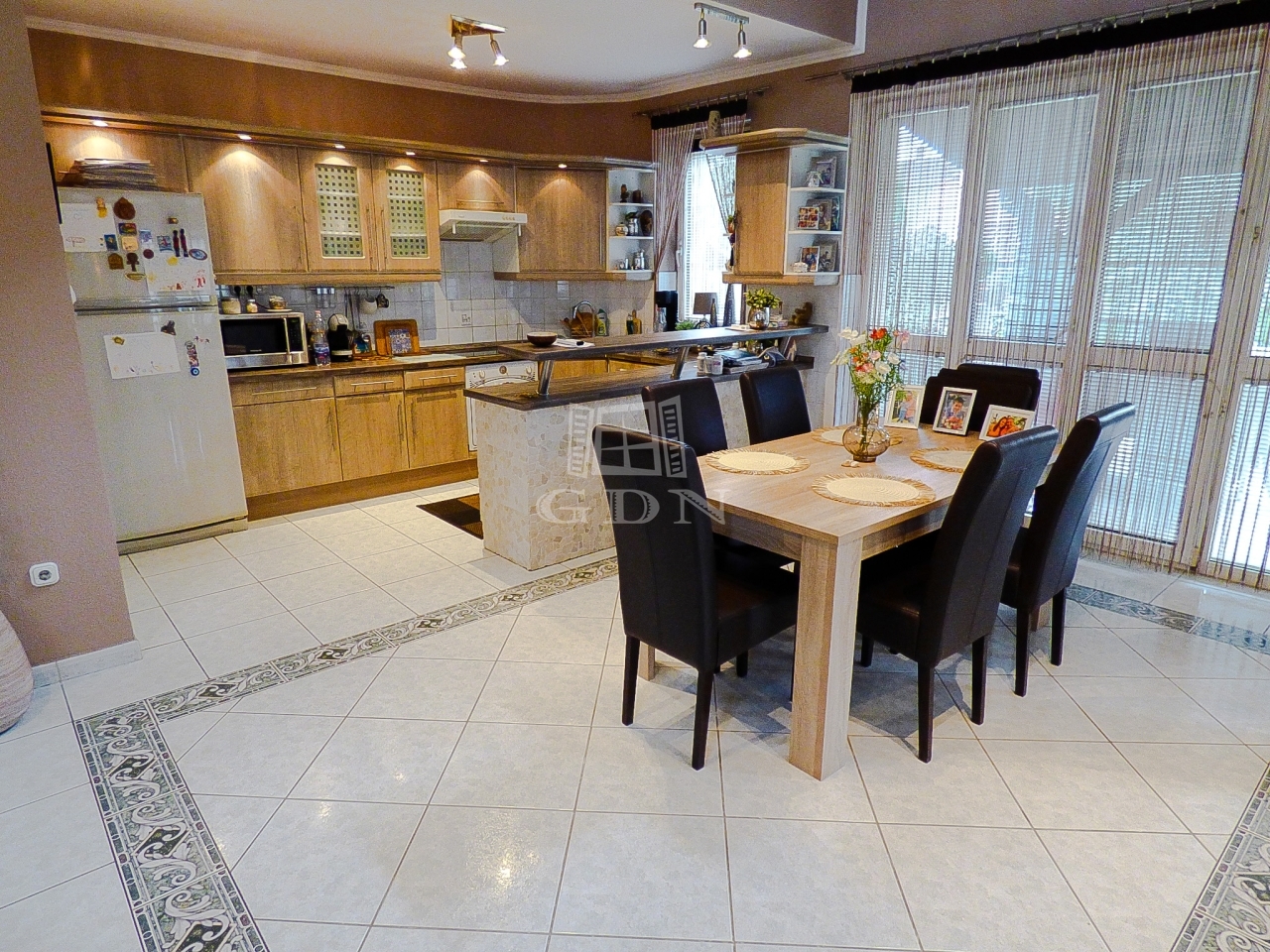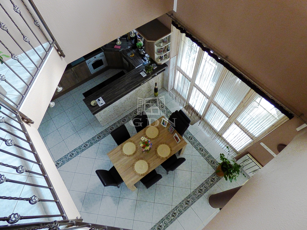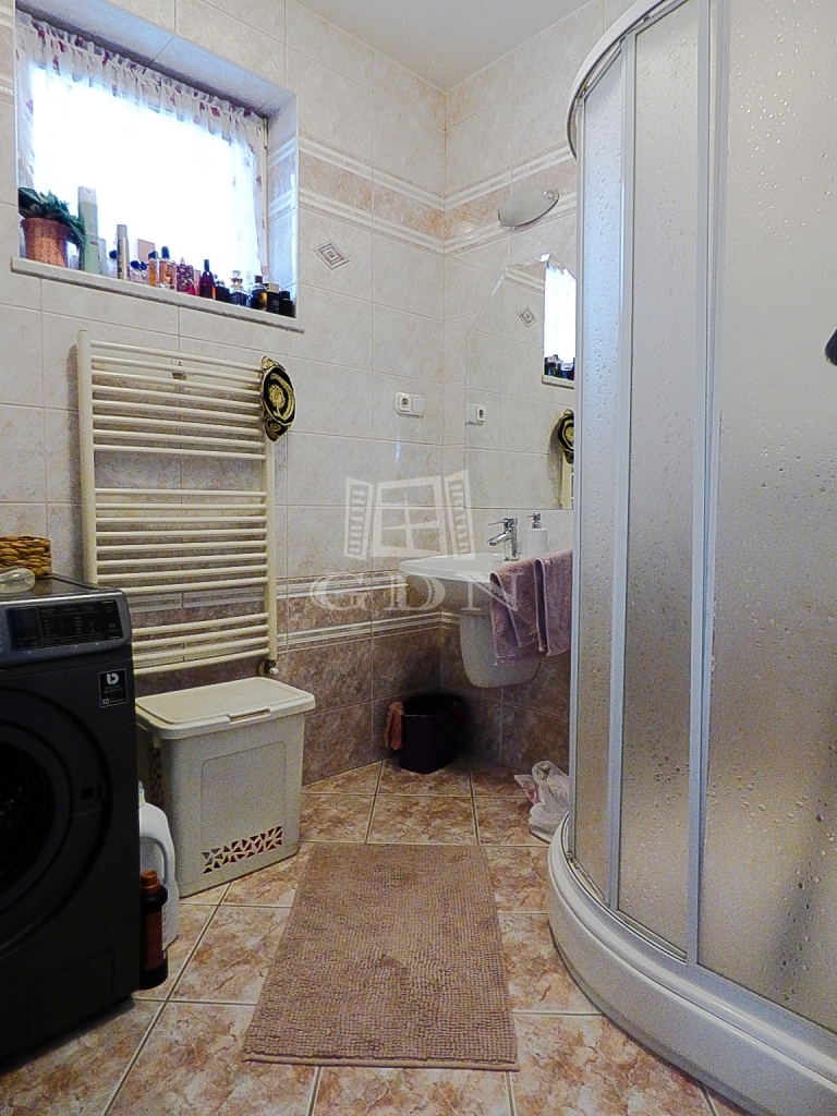 A földszinti részre a belső lépcsőházból is feljuthatunk, ezen lakrészen hatalmas, Dél - Keleti fekvésű, az étkező felett aula jellegű amerikai konyhás nappali, fürdőszoba, külön wc, minden helyiségben padló - és radiátoros fűtéssel, klímás hűtéssel, fedett (cca. 30 nm), - kertkapcsolatos terasz lett kialakítva.