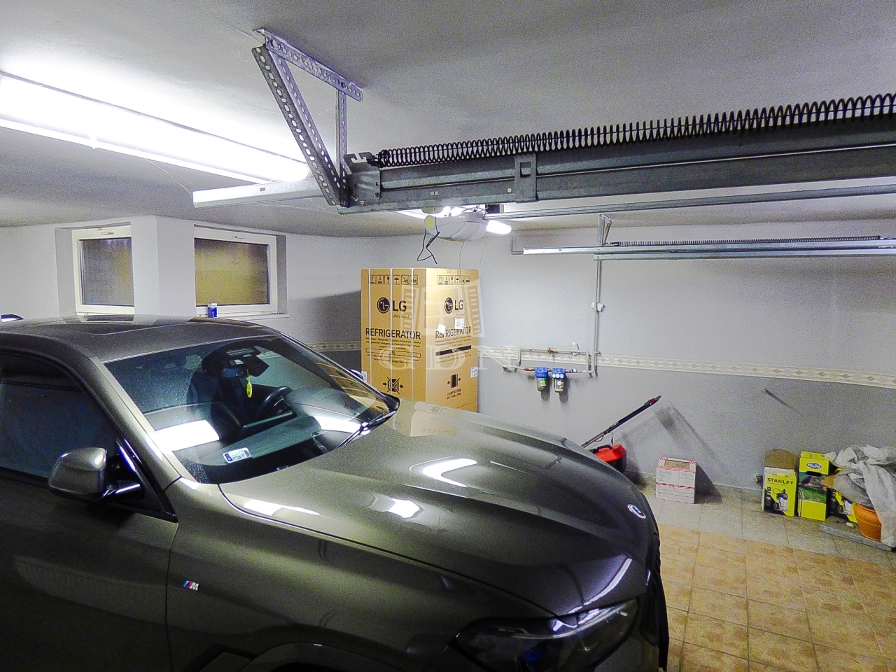 A szuterén szinten fűthető, dupla garázs, kazánház és mosókonyha, hobby, dolgozó, esetleg vendég szoba, több tároló, fürdőszoba kapott helyet.