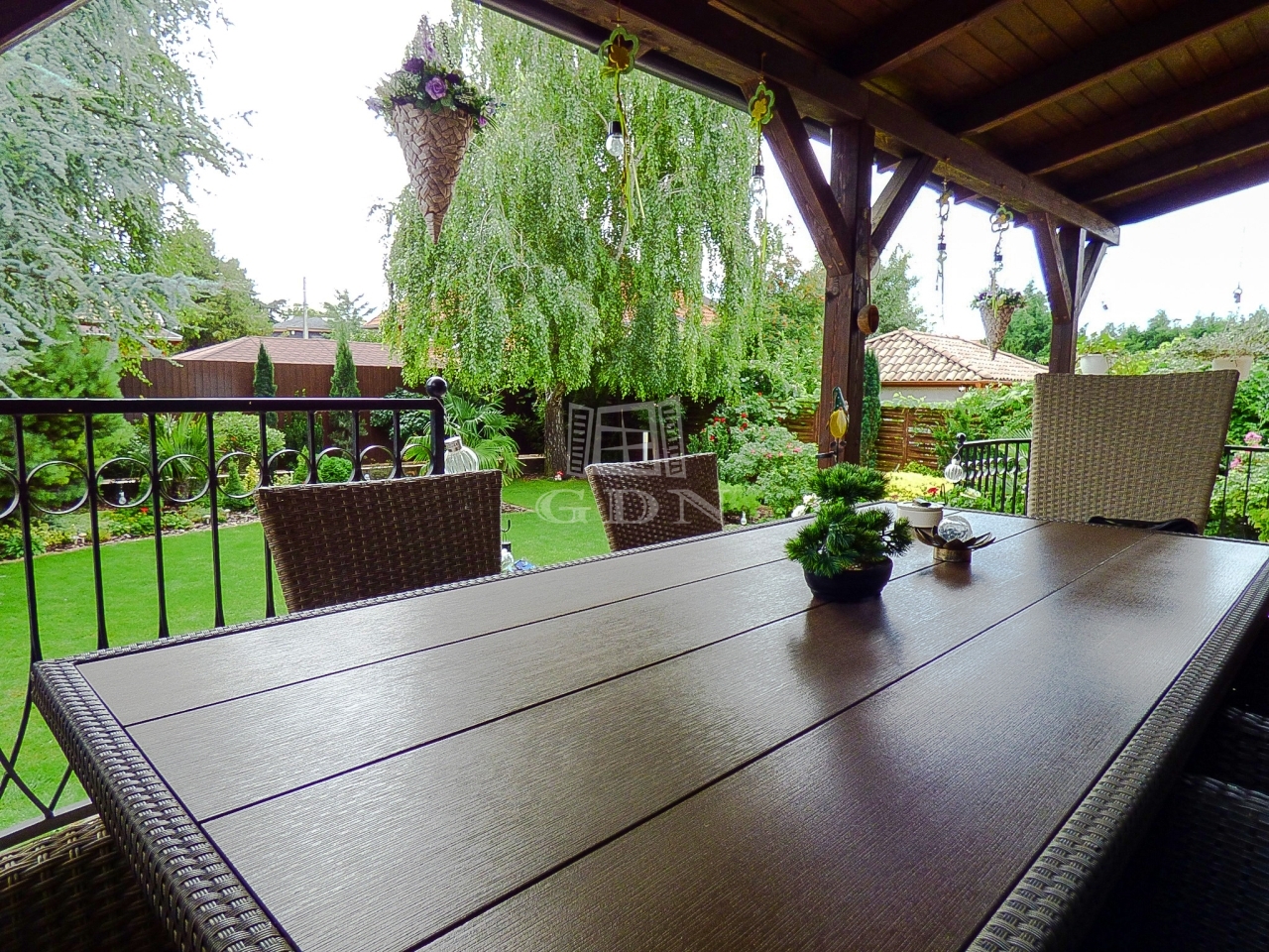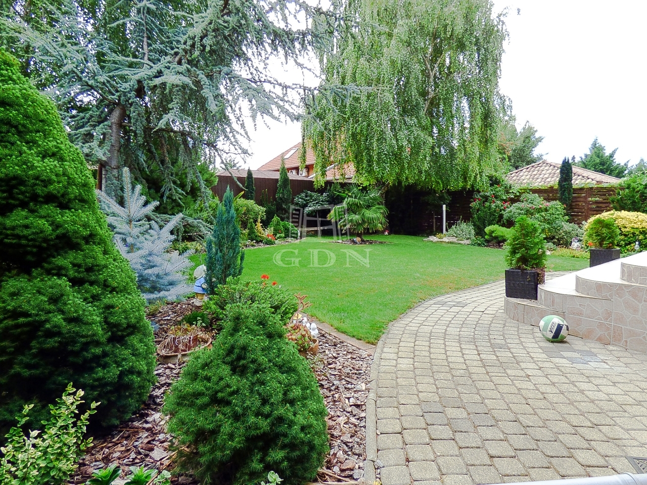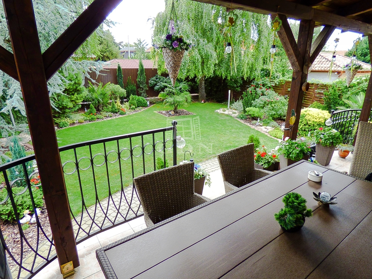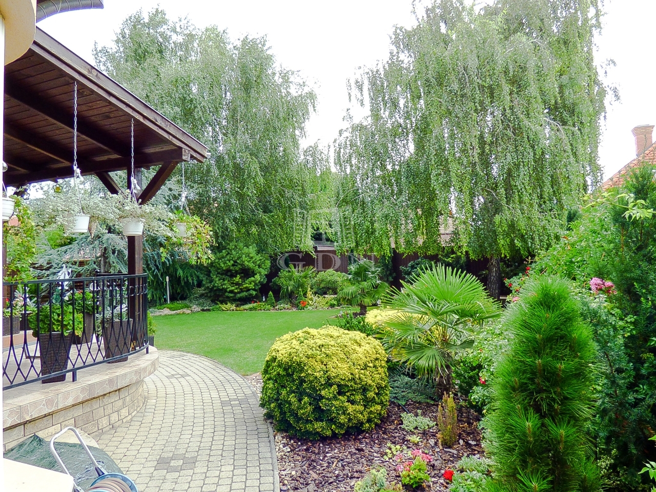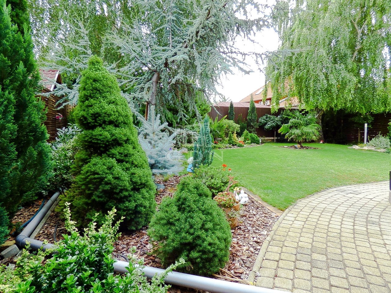 A kert rendezett, gondozott, öntöző rendszerrel, fúrt kúttal ellátott.