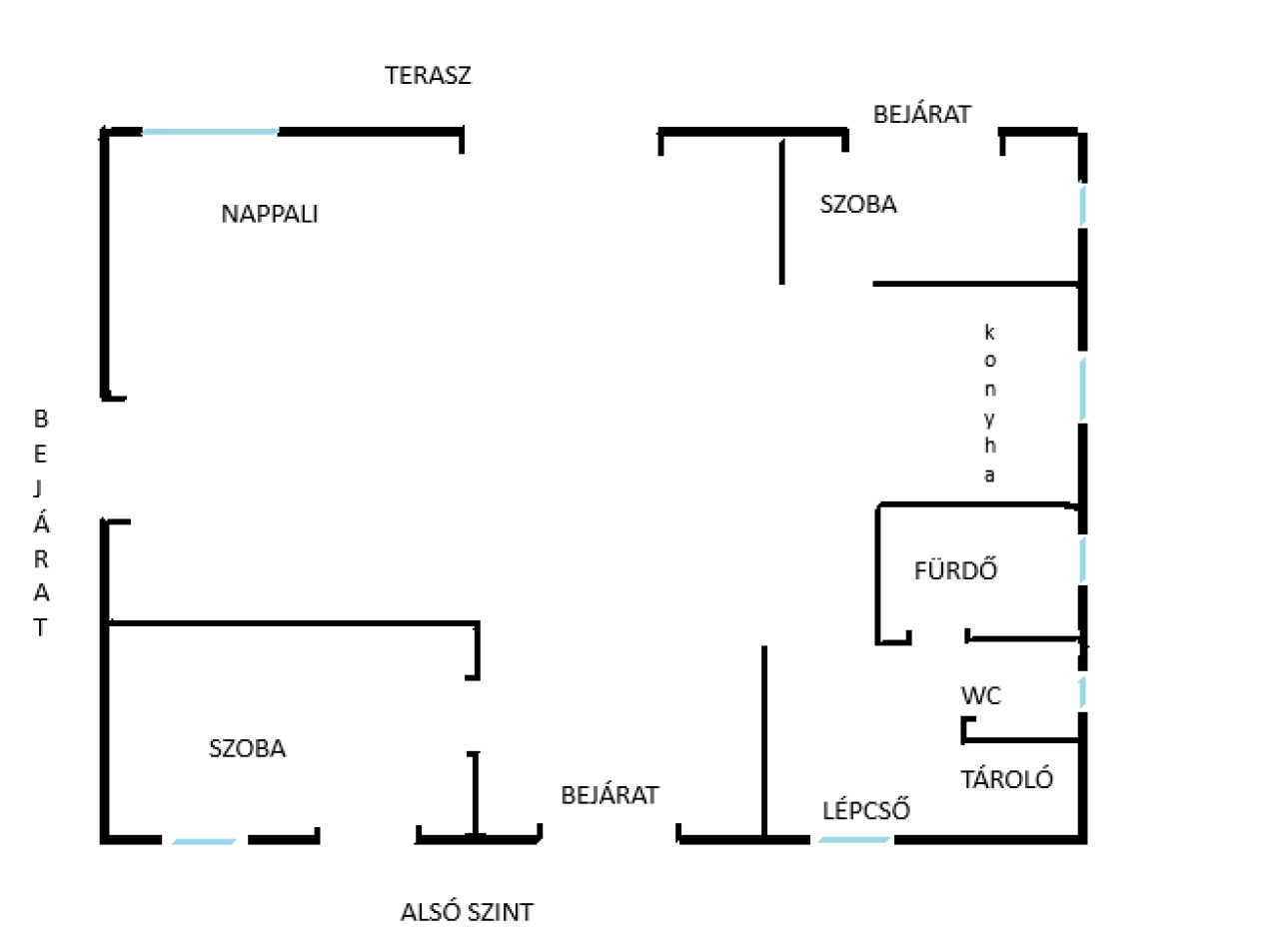 Földszint: Hatalmas, világos nappali, konyha és fürdőszoba.