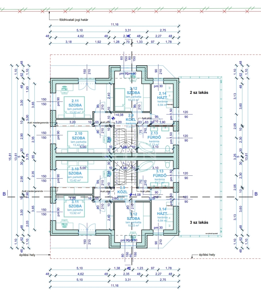 Telek: 1300 m² összesen (lakásonként min. 400 m² saját, leválasztott rész)