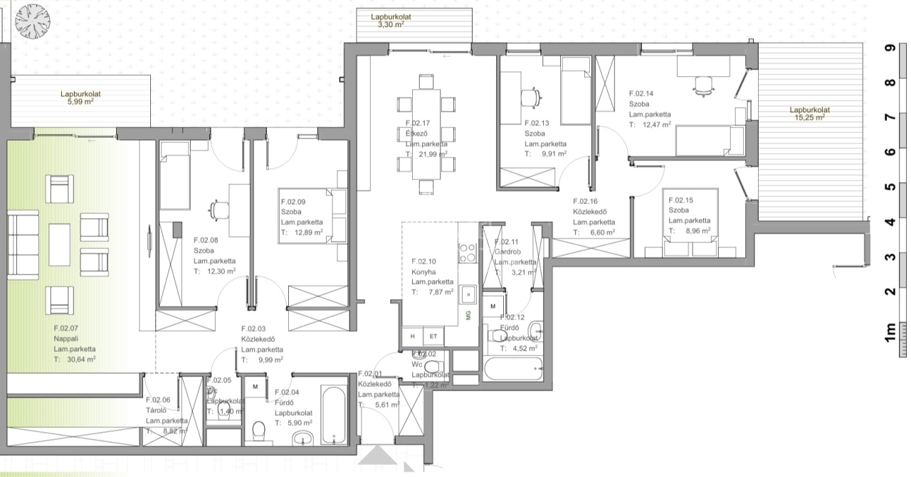 Teremgarázsban beállási lehetőség: 9 MFt./db. ( 16 m2/db. ), összesen 2 db. szabad van.