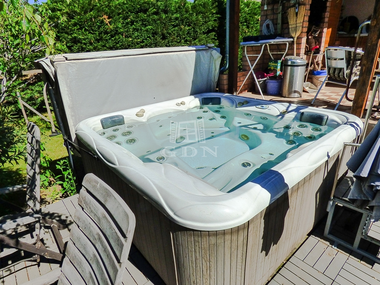 A kert rendezett, öntöző rendszerrel, fúrt és ásott kúttal ellátott, hobby állatoknak kialakított kenellel és egy tárolásra alkalmas 9 nm-es kis faházzal.