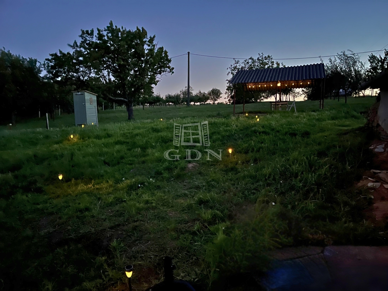 Az aszfaltos út mentén lévő telken található egy felújítandó kb. 20 m2-es ház (gazdasági épület), amelybe a víz és villany már be van vezetve. Az épület mellett 3 m3-es szennyvíztartály került elhelyezésre. A telek legfelső részén különböző fák (alma, körte, szilva, kajszi, cseresznye, meggy mellett 3 nagyobb diófa és 8 db 2-3 éve telepített mandulafa) vannak telepítve.