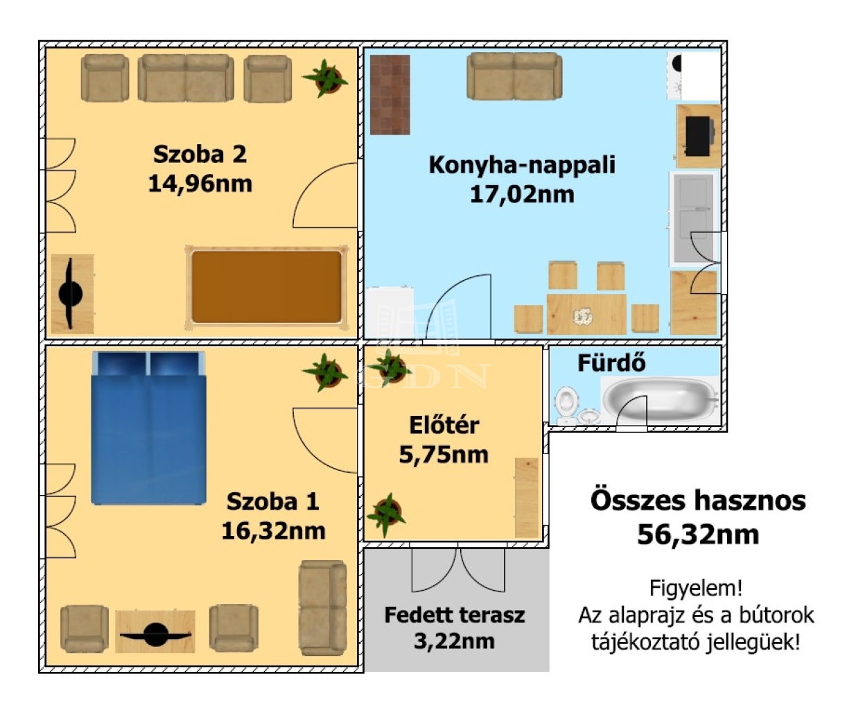 A kertes ház hasznos alapterülete 56,32nm, melyben található: