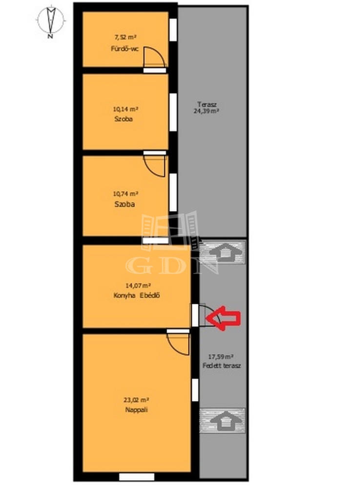1+2 félszoba, konyha-ebédlő, fürdőszoba.