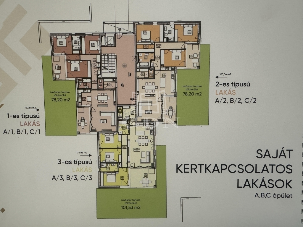 Az A 1-es típusú lakás 115,91 négyzetméteres, amelyhez 78,2 négyzetméteres saját kertkapcsolat