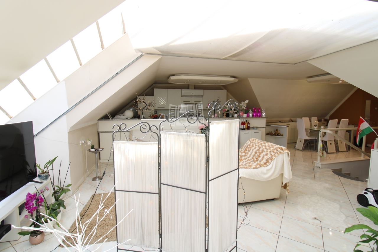 Felső szintre kényelmes fokkiosztású stabil lépcsőn juthatunk fel ahol is kettő félszoba, tágas világos fürdőszoba, illemhely és egy hatalmas amerikai konyhás nappali kapott helyet