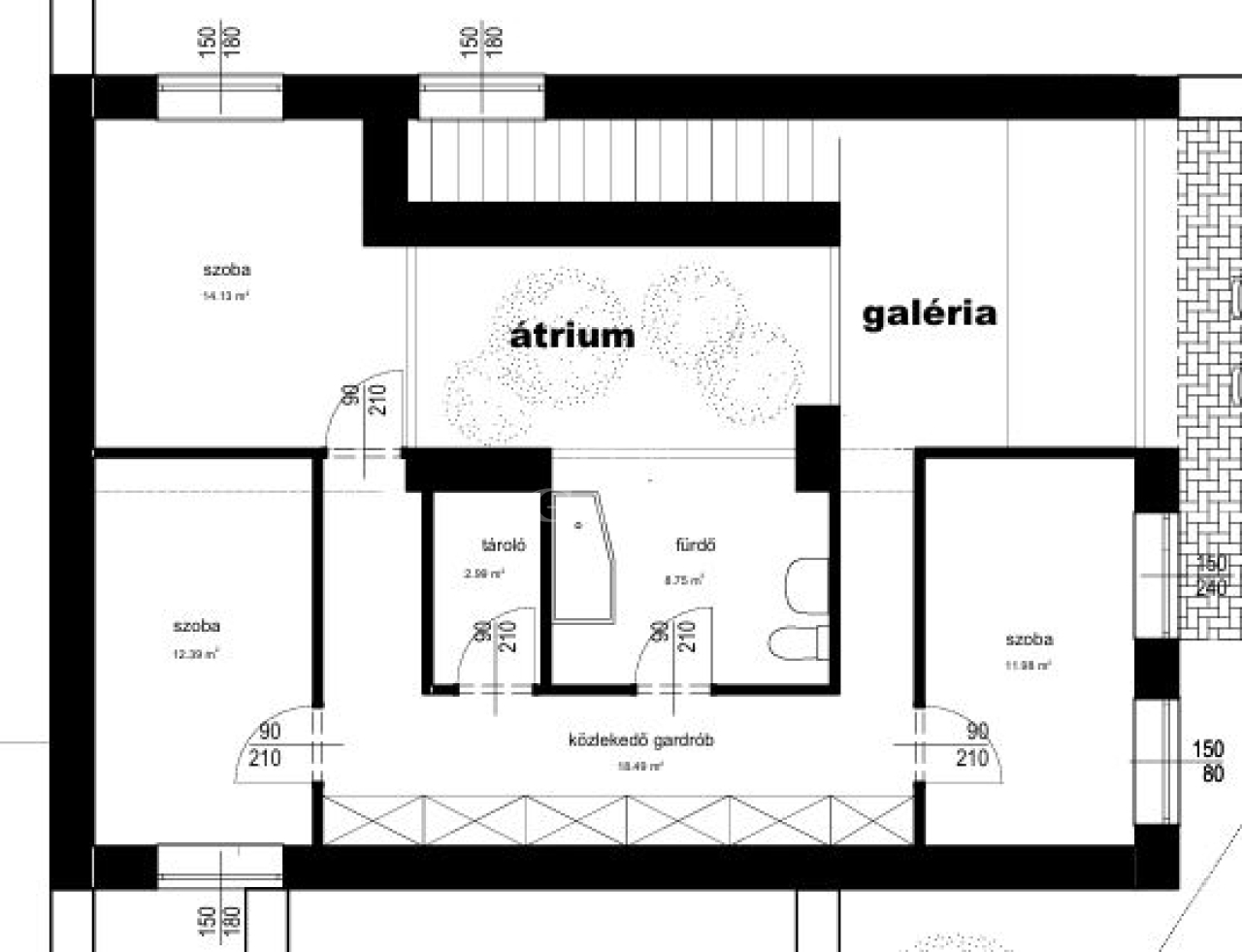 5 hálószoba (az emeleten még alakítható a szobák száma, mivel a válaszfalak nem lettek beépítve. Így további szobákkal bővíthető.)