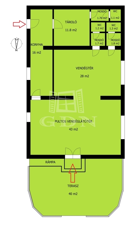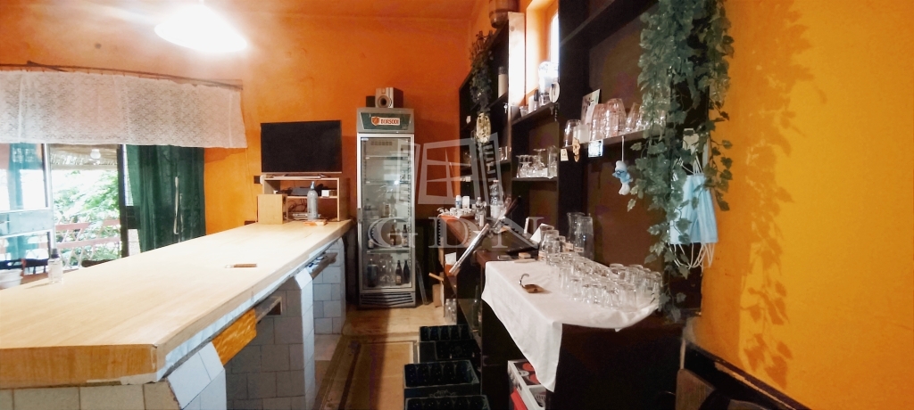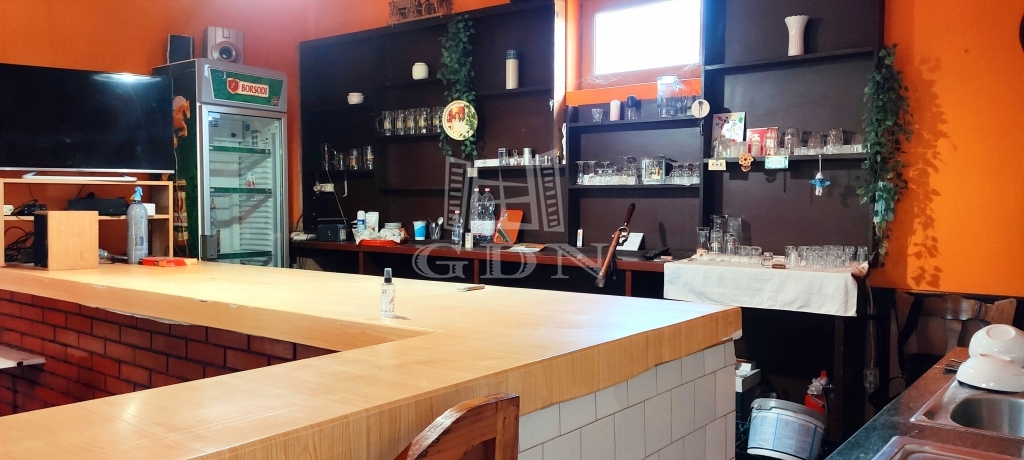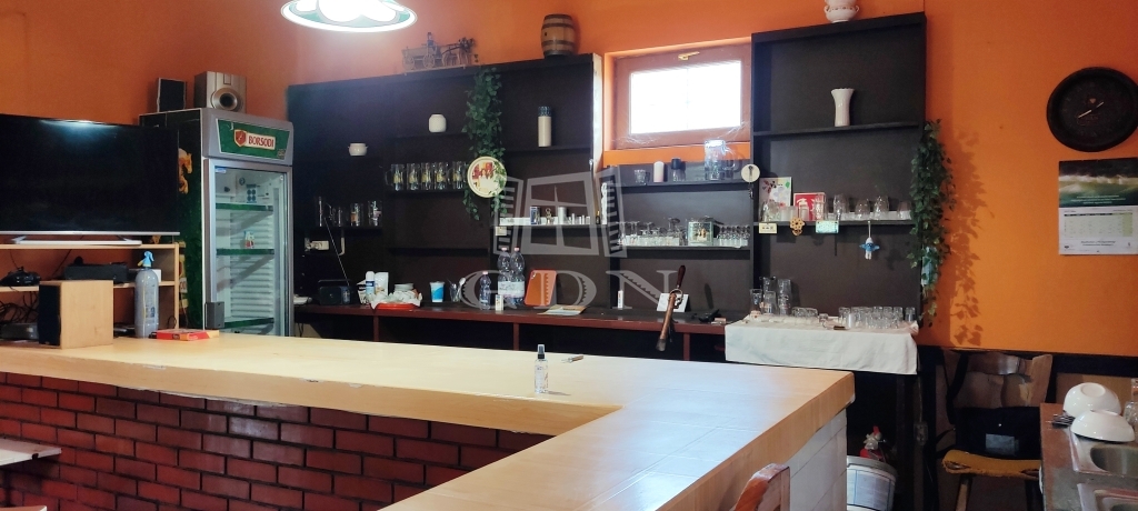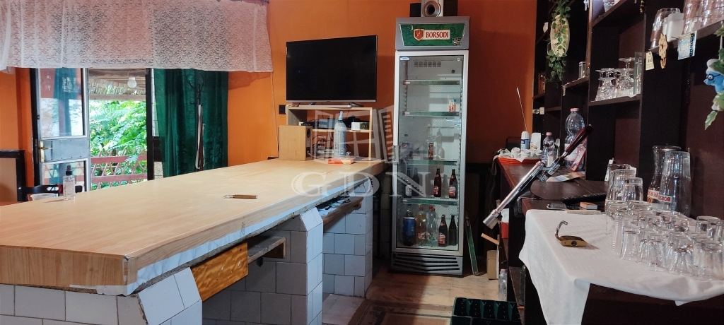 A terasz felől közelíthető meg a pulttal rendelkező 43 m2 alapterületű helyiség, ezen át pedig a másik vendégtér, valamint külön női és férfi mosdók.