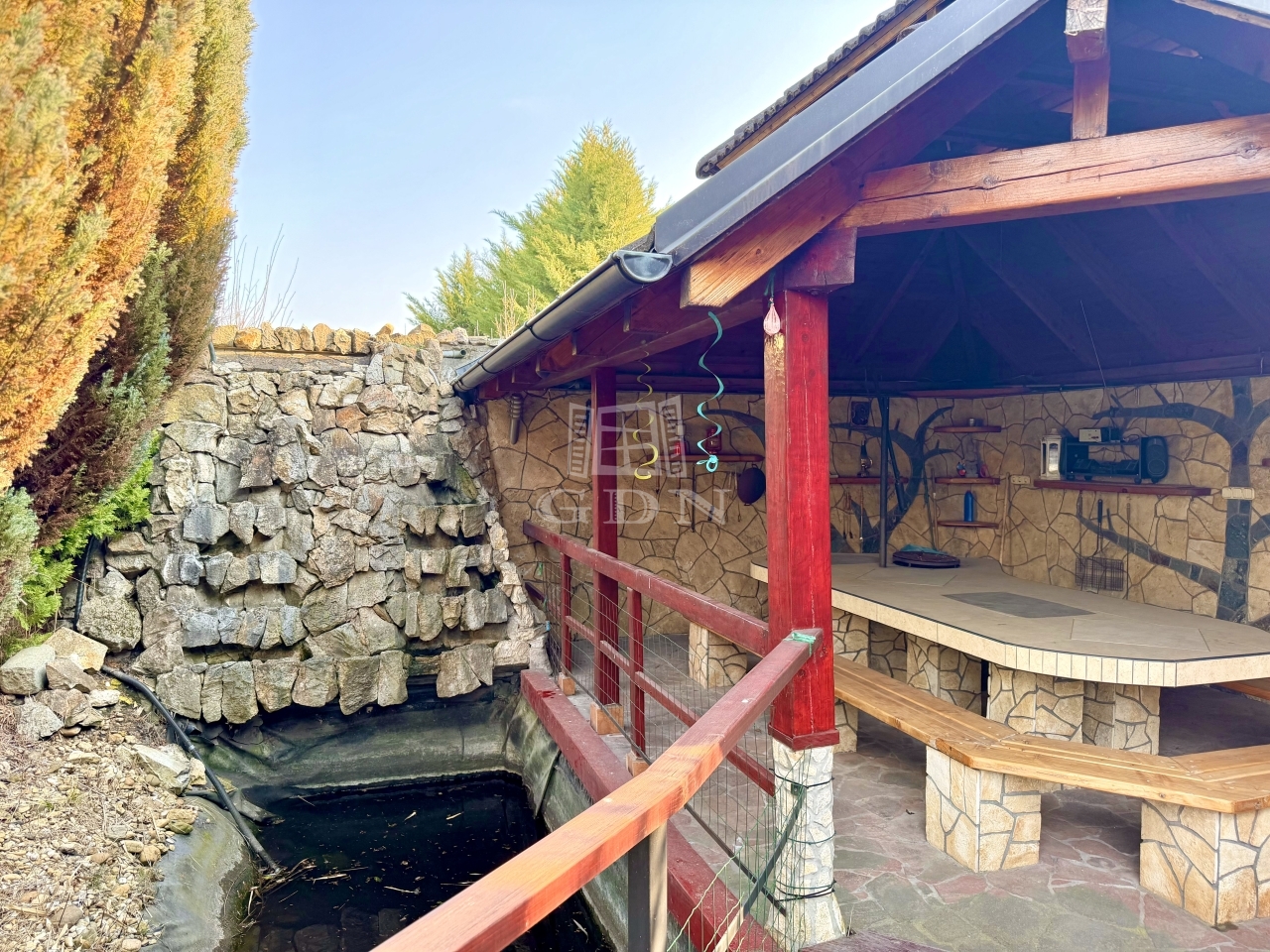 A telek összesen 960 négyzetméter, tökéletes helyszín kerti partikhoz, ugyanis a kertben egy szaletli is kialakításra került a saját vízesés mellett.