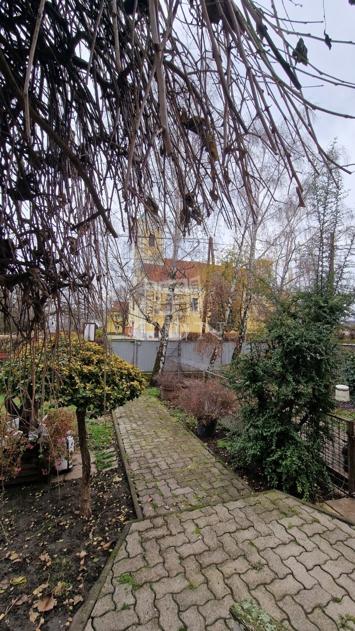 A családi ház két oldala is utcafrontra néz, mégis csendes és nyugodt, köszönhetően az előkertnek, amely kellemes távolságot biztosít az úttól.