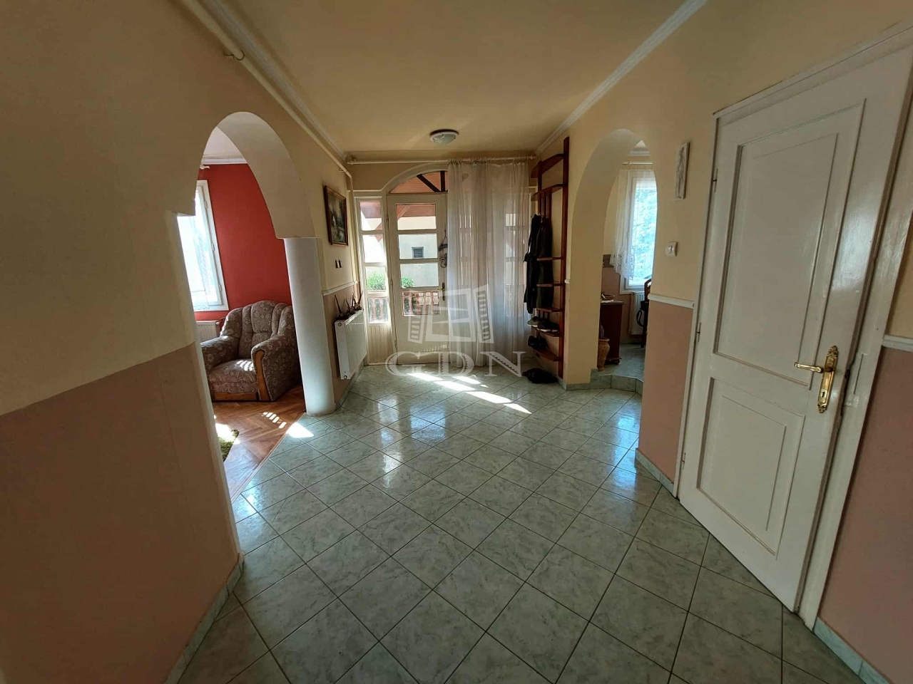 Világos, nyitott előtér, nappali és étkező,