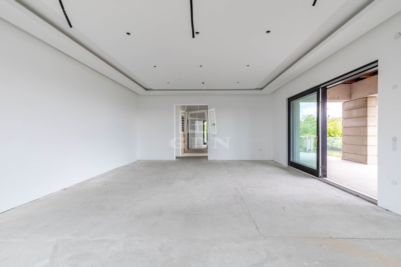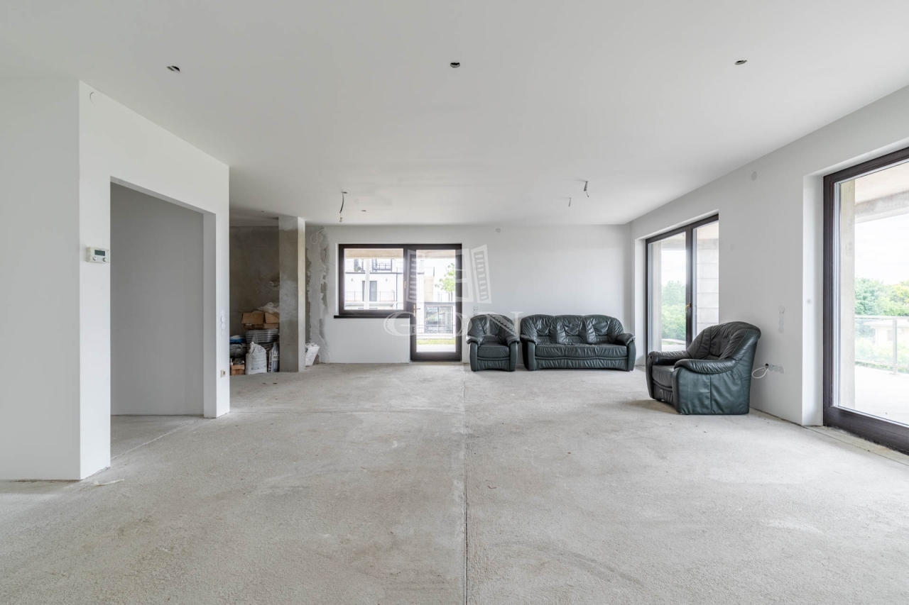 A 112 nm-es nettó alapterületű emeleten 1 nappali (kandalló előkészítéssel), 3 szoba, 2 fürdőszoba, valamint 101 nm-es részben fedett és pergolás körpanorámás terasszal.