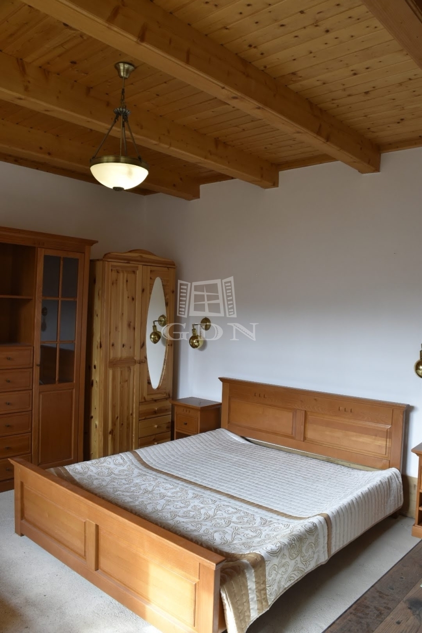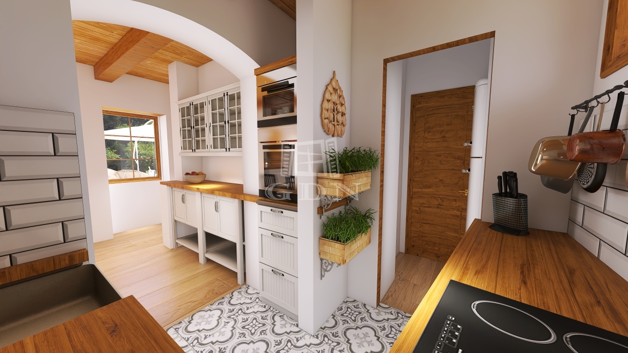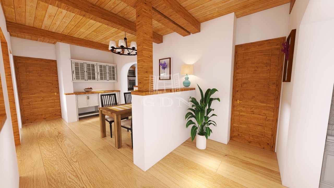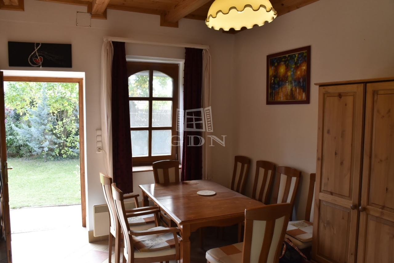 A lakrész egy hangulatos teraszból, utcafronti nagy nappaliból, étkezőből, konyhából, tágas hálószobából és fürdőszobából áll. Az eredeti, százéves gerendák gondos felújításon estek át, megőrizve a ház autentikus báját.