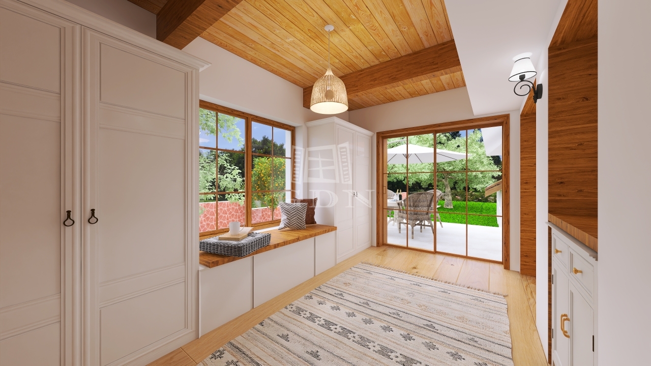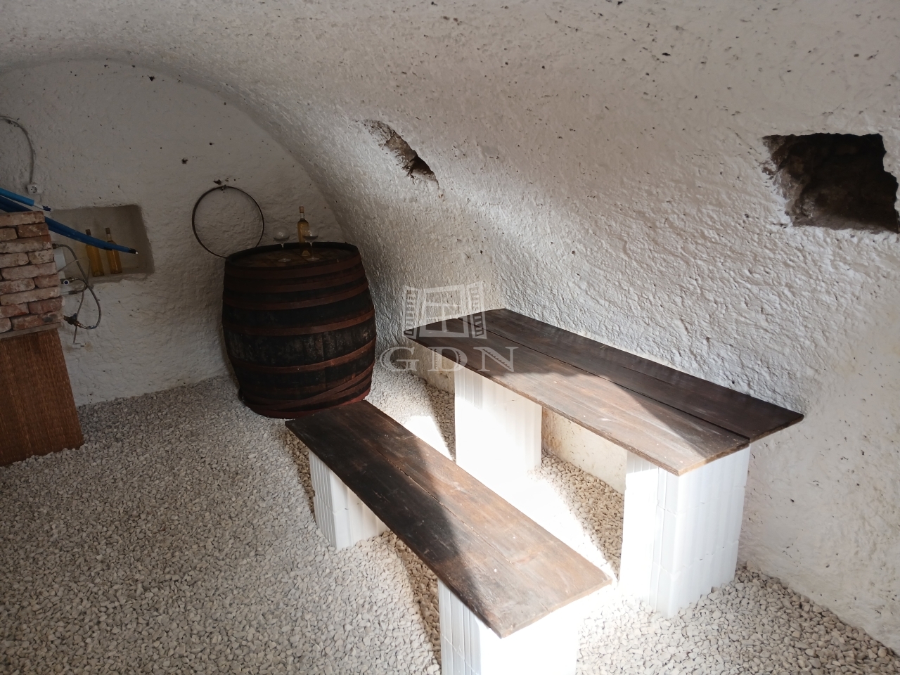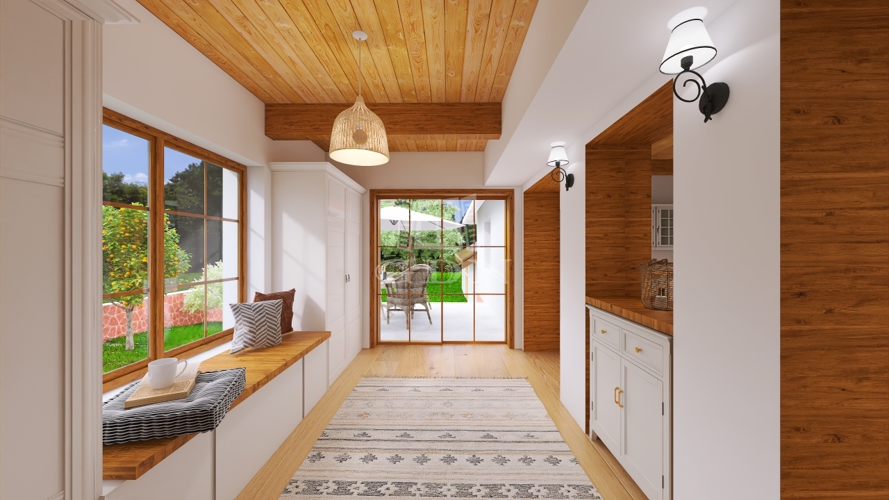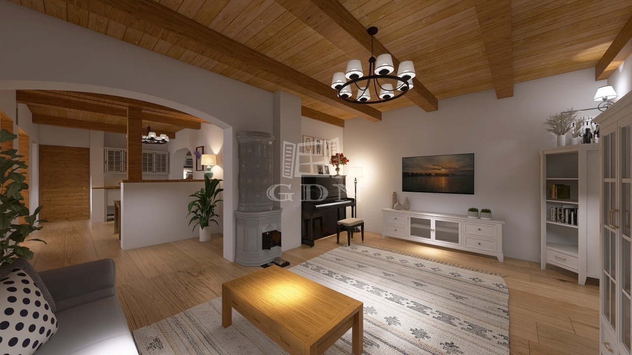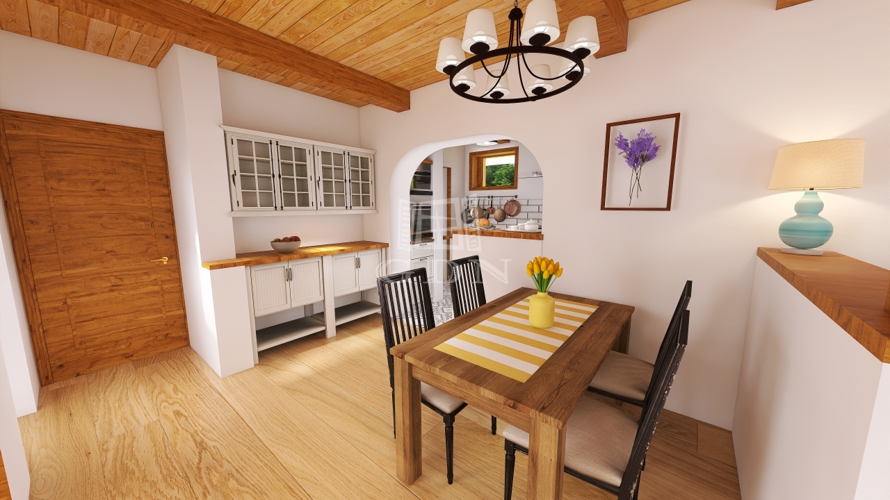 A lakrész egy hangulatos teraszból, utcafronti nagy nappaliból, étkezőből, konyhából, tágas hálószobából és fürdőszobából áll. Az eredeti, százéves gerendák gondos felújításon estek át, megőrizve a ház autentikus báját.
