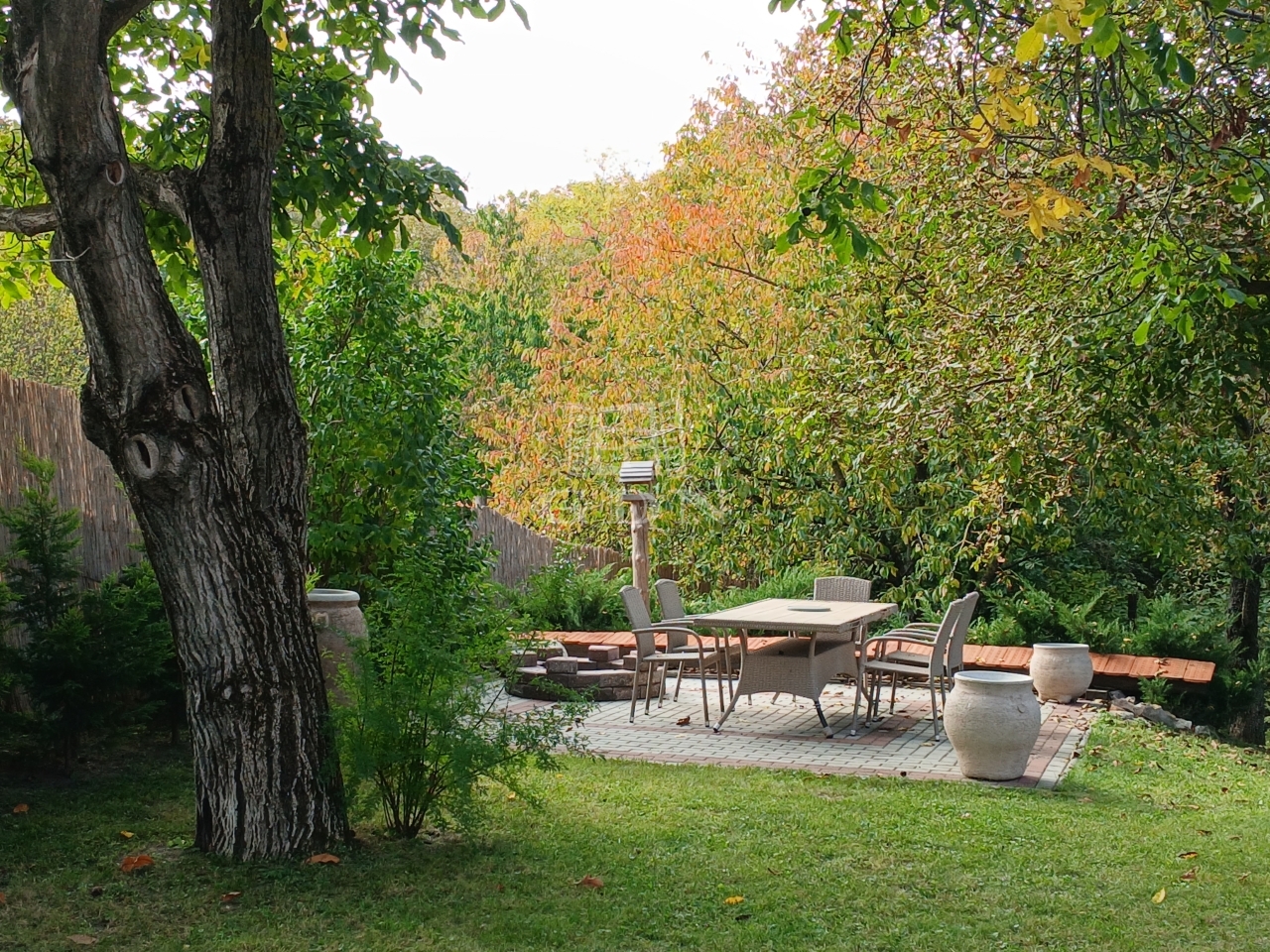 A gondosan megtervezett udvarban gyümölcsfák, bokrok, örökzöldek és virágok teszik idillivé a környezetet. Egy mediterrán hangulatú, fedetlen szaletli hív pihenésre, a telek alján pedig egy kis patak csörgedezik, tovább fokozva a természetközeli atmoszférát.