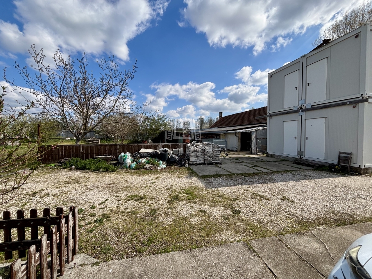 A területen több fedett tároló, valamint egy szerelőaknás garázs is található. A parkolás több jármű számára is kényelmesen megoldott a telken belül.
