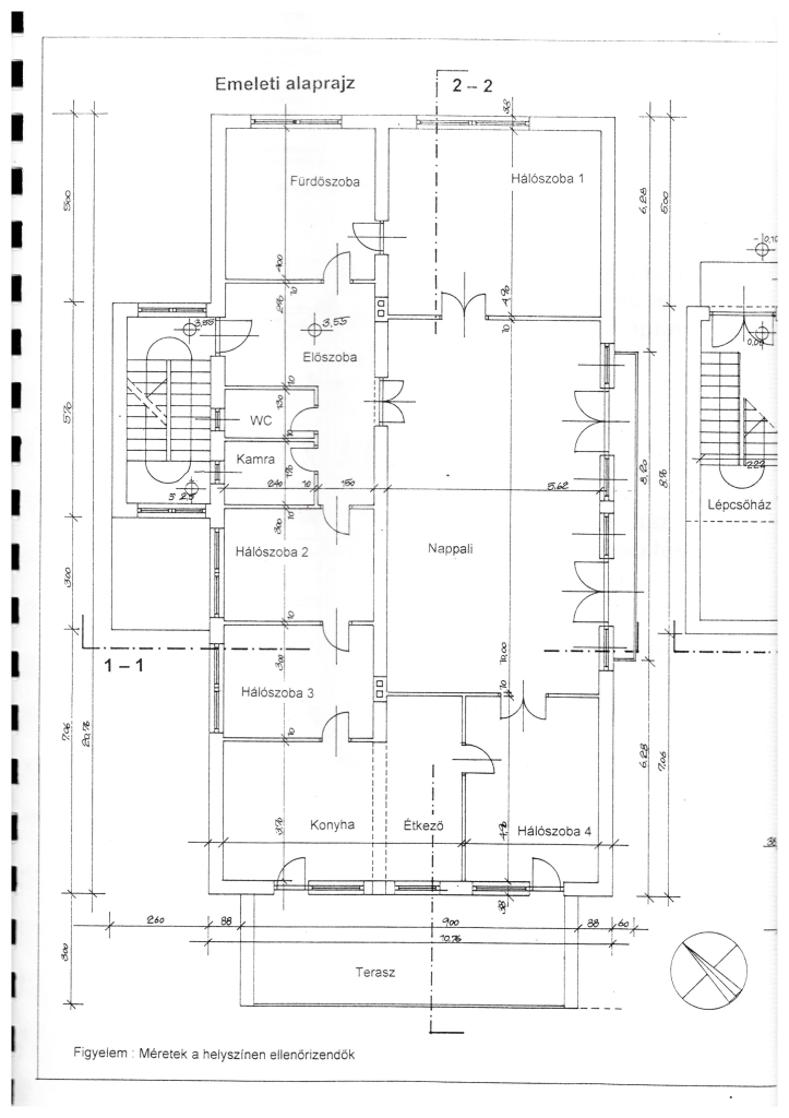 előszoba, közlekedő, nappali(66m2) konyha+étkező(24m2), 4 szoba(12m2, 12m2, 24m2, 16m2), fürdőszoba+Wc, Wc, gardrób(4m2), teraszok(27m2).