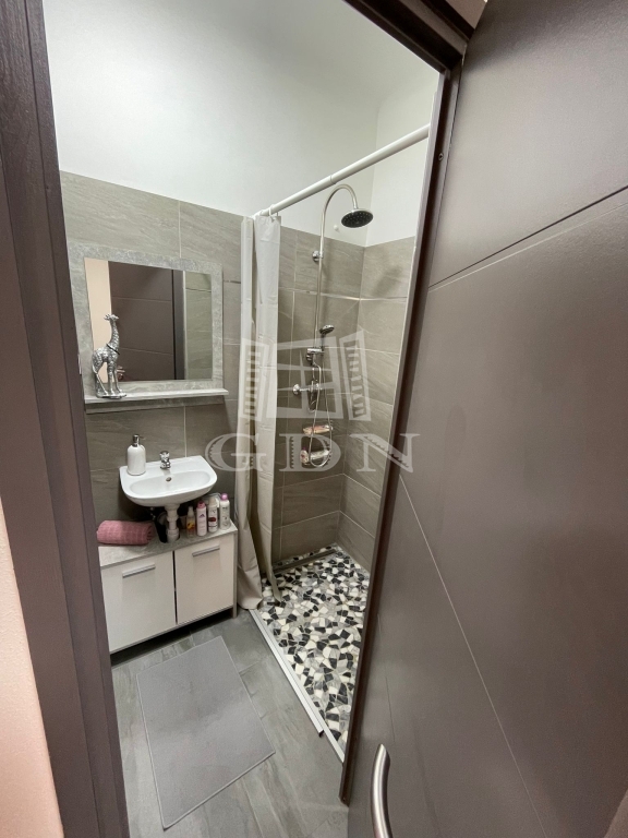 Tartozik hozzá még egy külön beépített zuhanyfülkés fürdőszoba mosdókagylóval és külön WC.