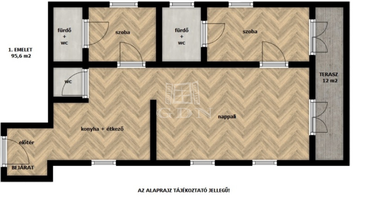 1. EMELET: 95,6 m2 – 3 szoba – 2 fürdő – TERASZ: 12 m2