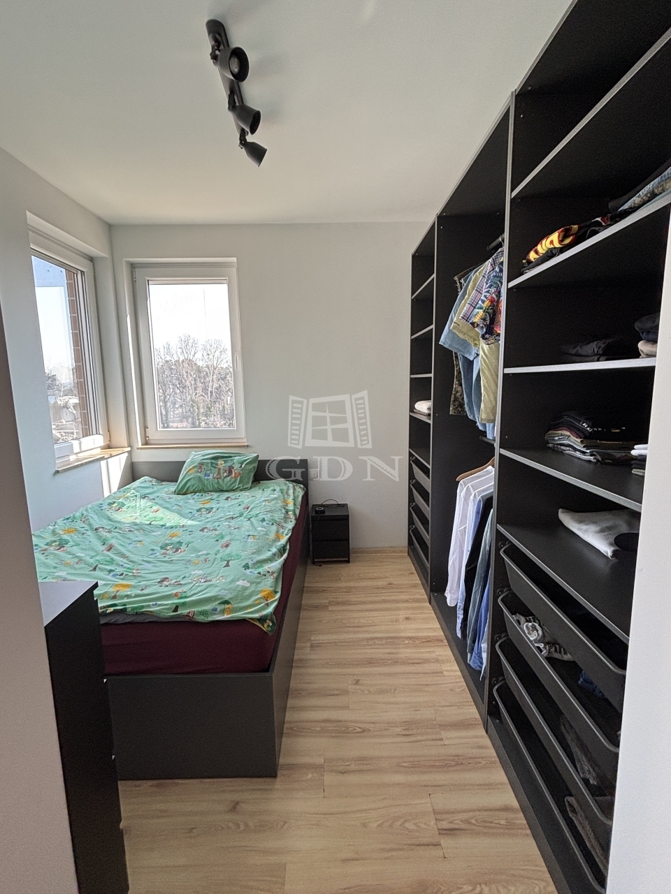 Valamint egy gardróbos hálószoba déli fekvésű ablakokkal.
