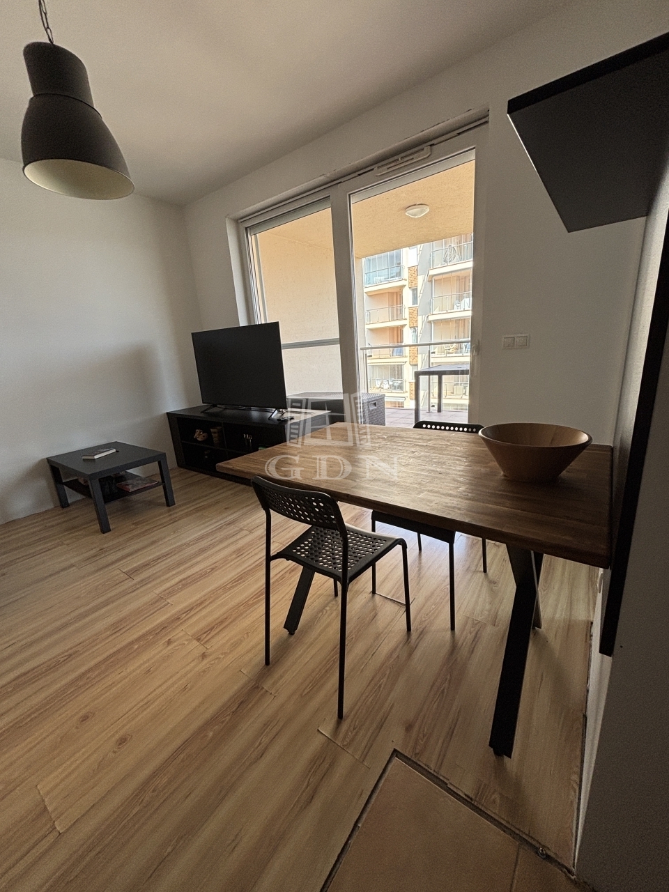 A nappali praktikusan lett berendezve: ülőgarnitúra, tv, étkező, konyha.