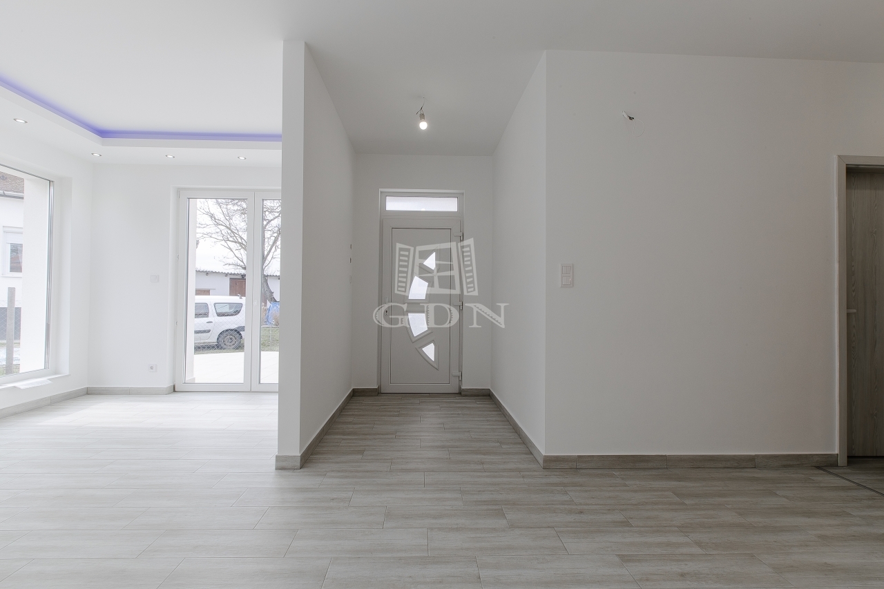 Dekorfóliás belső ajtók. A homlokzati fehér műanyag nyílászárók 3 rétegű hőszigetelő üvegezésűek (U=1,0 W/m²K).