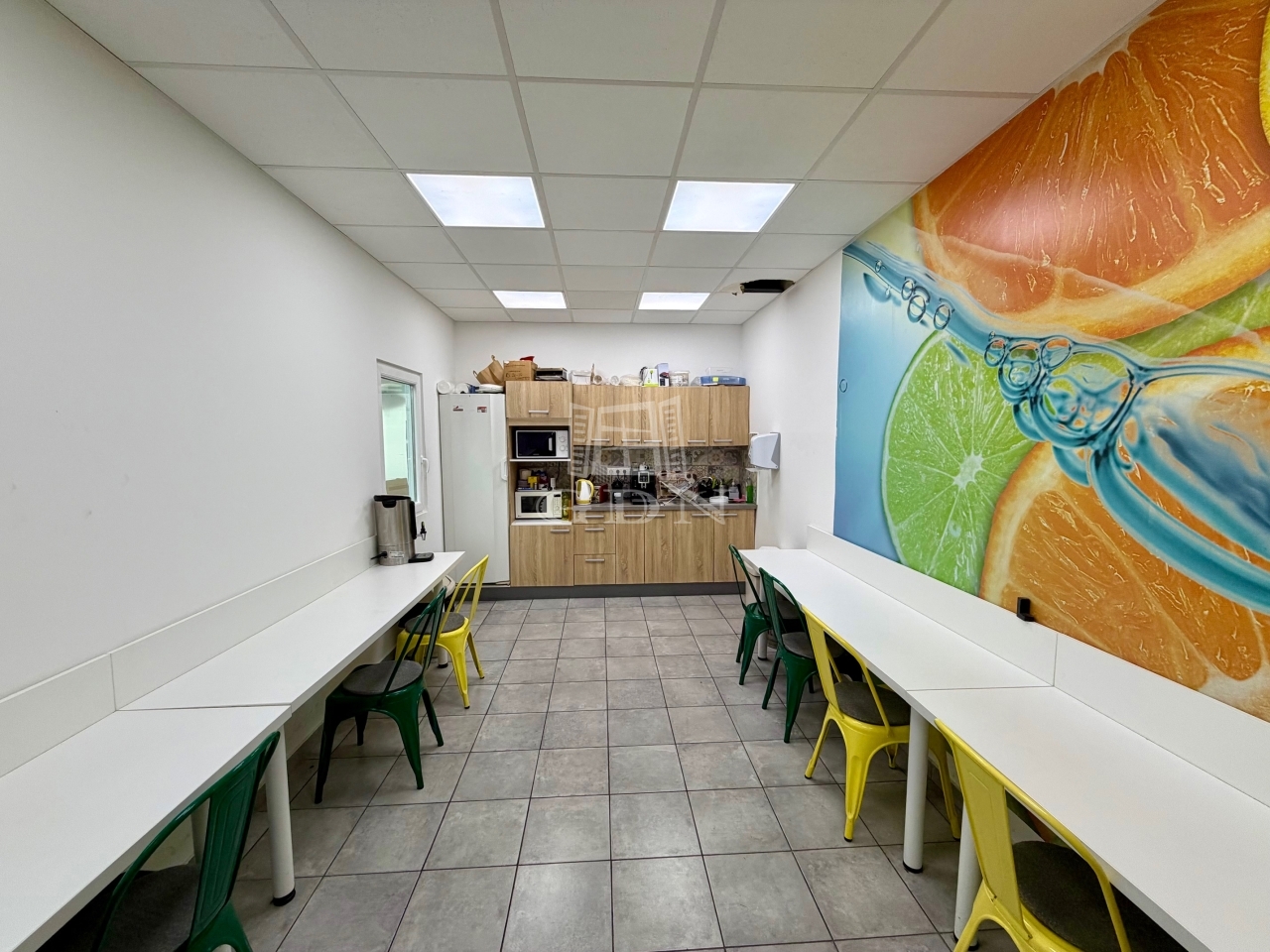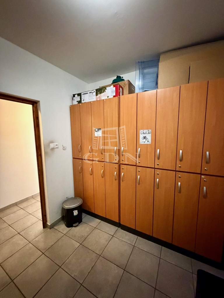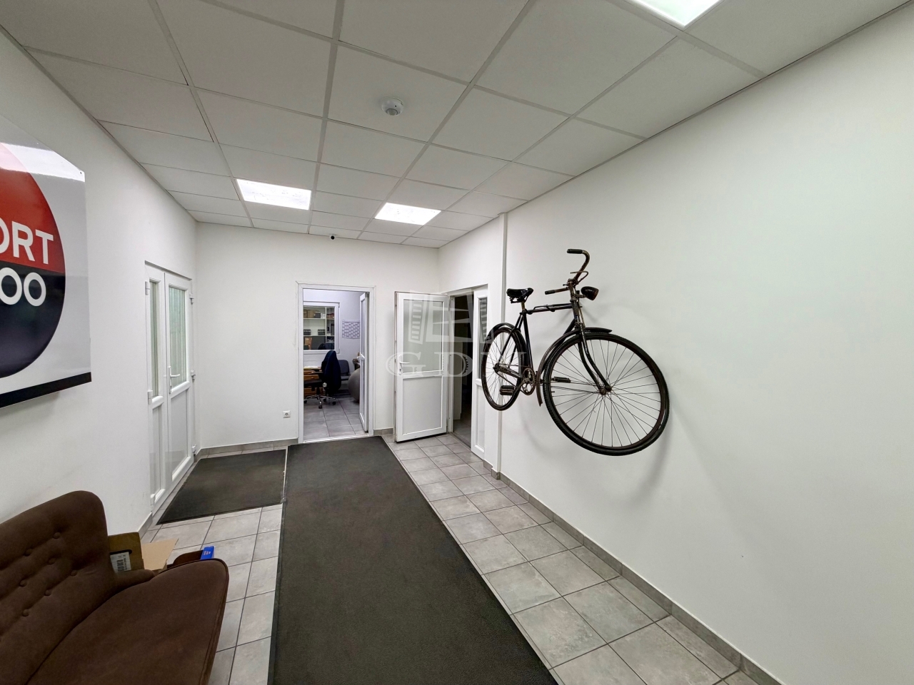 Az ingatlan kiépített szerves része a fent említett 240 m2 több helyiségből álló iroda, teakonyhával, vizesblokkal, öltözővel, amely padlófűtéssel, klímaberendezéssel rendelkezik.