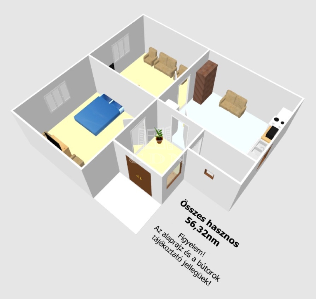 A kertes ház hasznos alapterülete 56,32nm, melyben található: