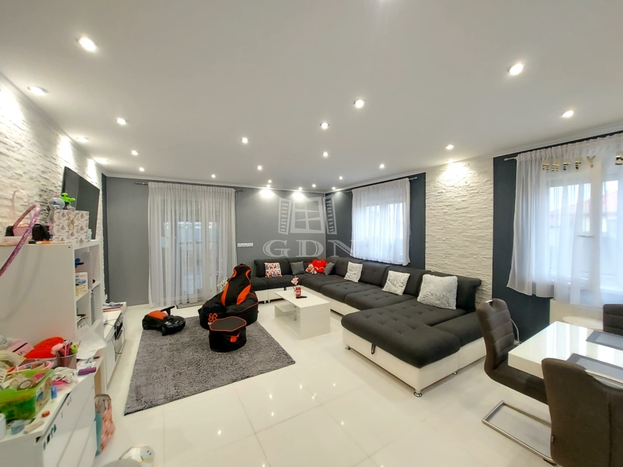 A lakható terület 148 nm, tágas amerikai konyhás nappali+ három háló, két fürdőszoba kádas-valamint zuhanyzós, kazánház, előtér-közlekedővel.