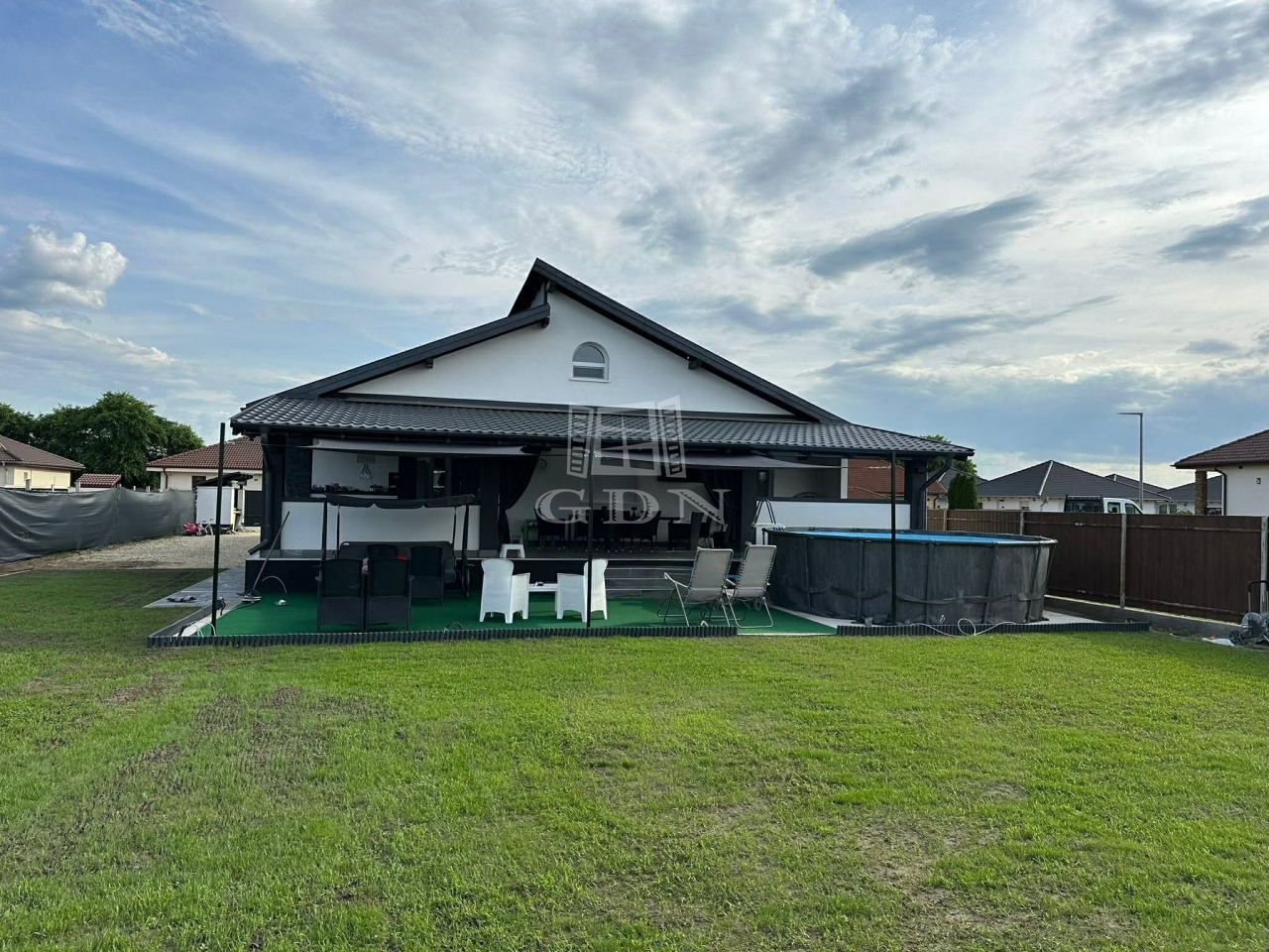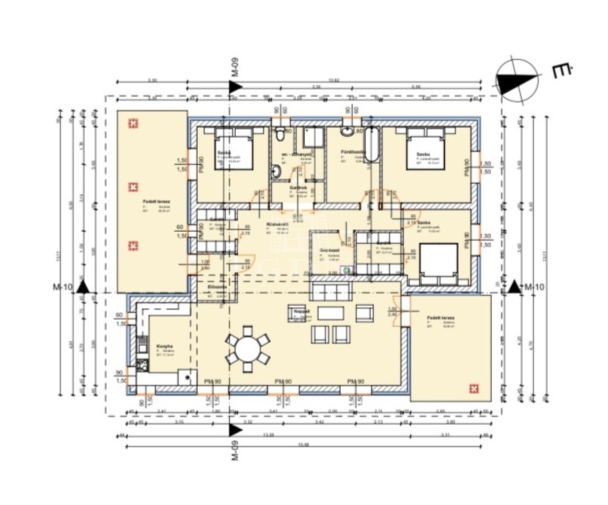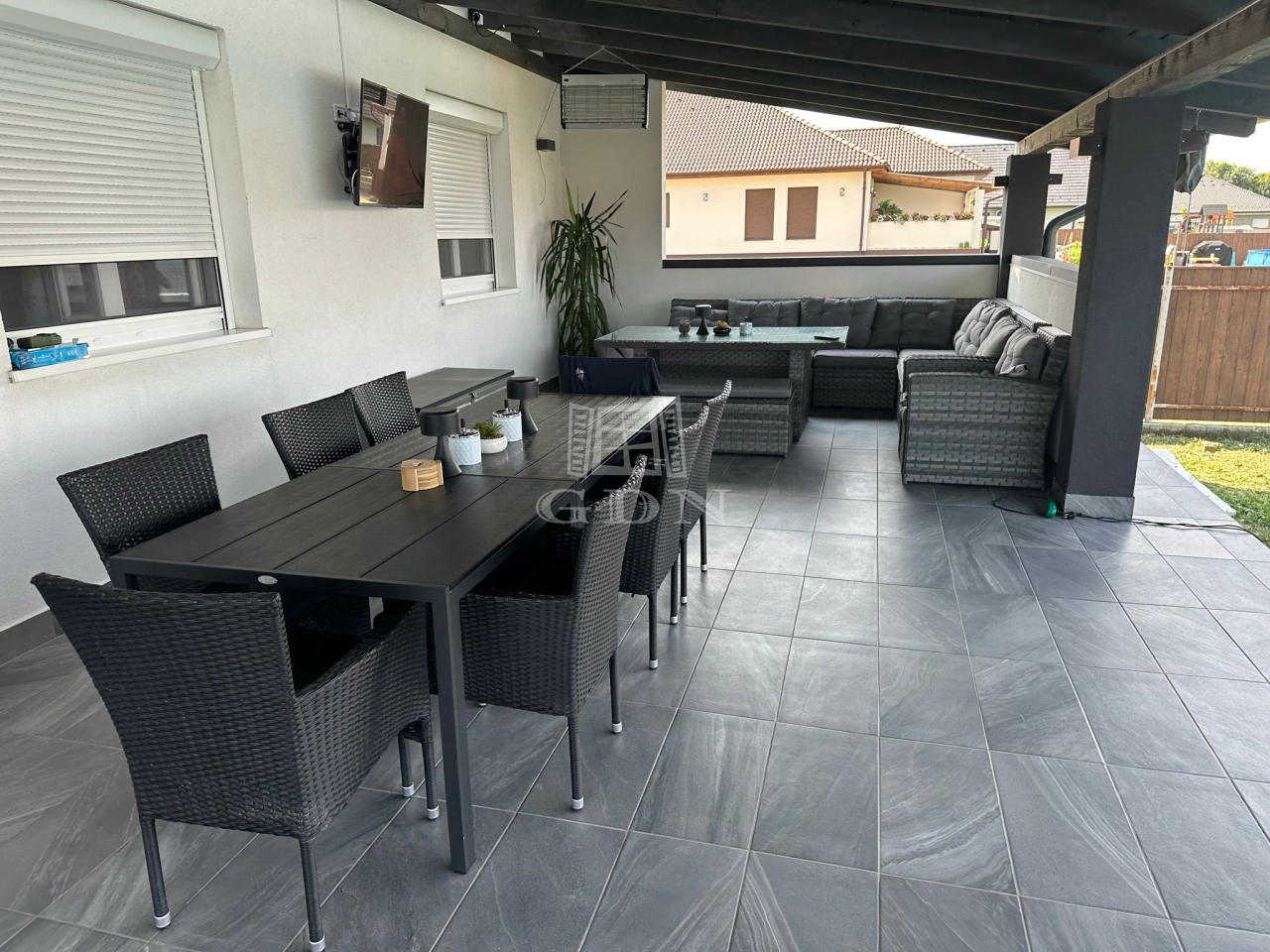 A ház egyedi hanhulatáról a 100nm-es fedett terasz(+ 60nm nem fedett) gondoskodik, ami remek kikapcsolódást bíztosít tavasztól késő őszig a család minden tagjának!