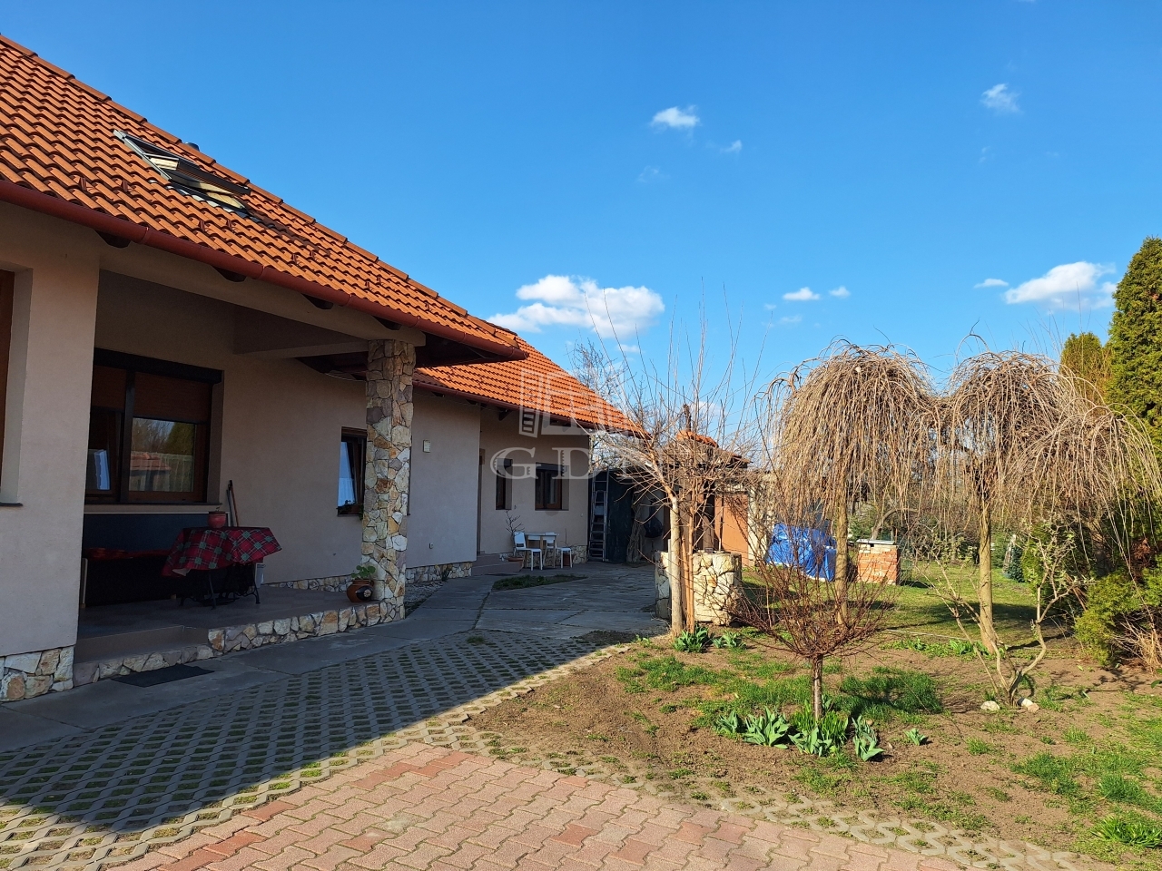 A 1079 m²-es, körbekerített telek gondozott, parkosított, amely ideális: