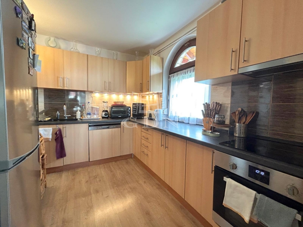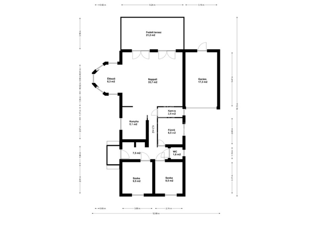 A nettó 90 m2 lakóterületű, 40 m2-es nappali - étkezővel rendelkező, két hálószobás, gázcirkó fűtéssel és 6,5 kW-os + 3,5 kW-os klímákkal, illetve fűtőpanelekkel is fűthető, földszintes, beton födémes, lemezcserép fedéses, 30-as tégla falazattal, 30 cm-es kőzetgyapot födém szigeteléssel, fa szerkezetű dupla üvegezésű nyílászárókkal rendelkező családi házhoz 21 m2-es fedett terasz, 16 m2-es pince és 17,3 m2-es, egyállásos garázs kapcsolódik.