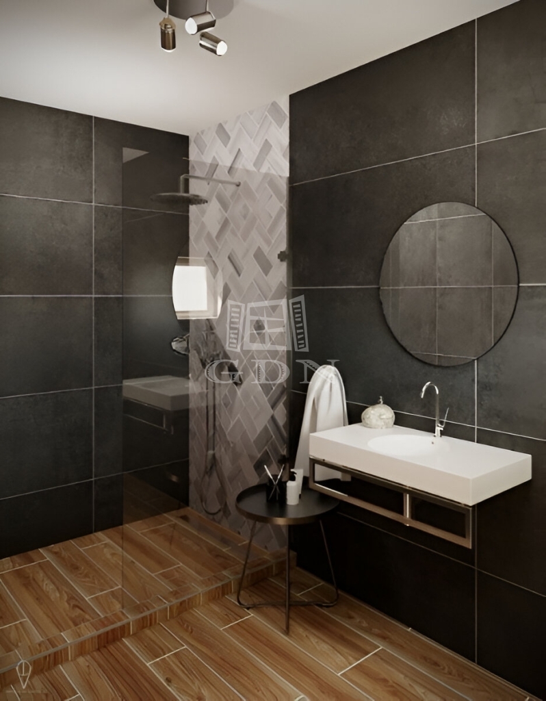 A telek lépcsőzetes adottságai révén az ingatlan szinteltolásos kivitelezéssel épült meg, ennek köszönhetően a földszinten (szinteltolással) található még egy hálószoba, háztartási helység, valamint még egy fürdőszoba is.
