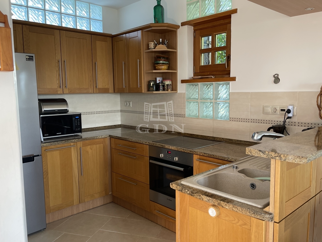 Földszint: nappali + étkező (19,8 m²) + konyha (7,2 m² ) légtérben split klímával, vendégszoba (8,9 m²) + zuhanyzós fürdő (2,4 m²)