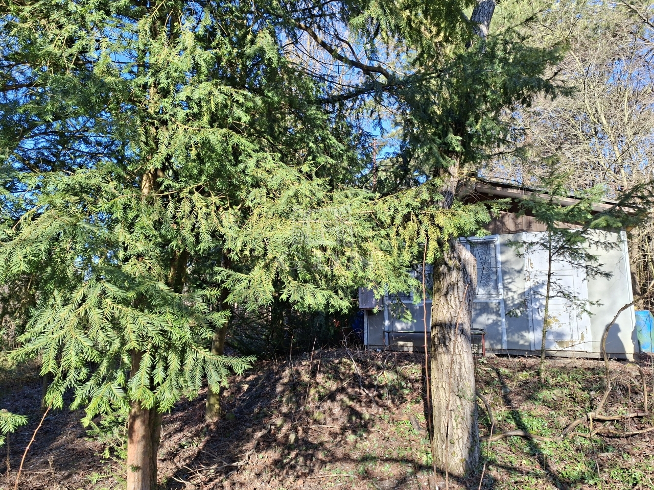 A telek zöld, a növényzet természetes, valamint van rajta egy barátságos kis ház, tárolóval.