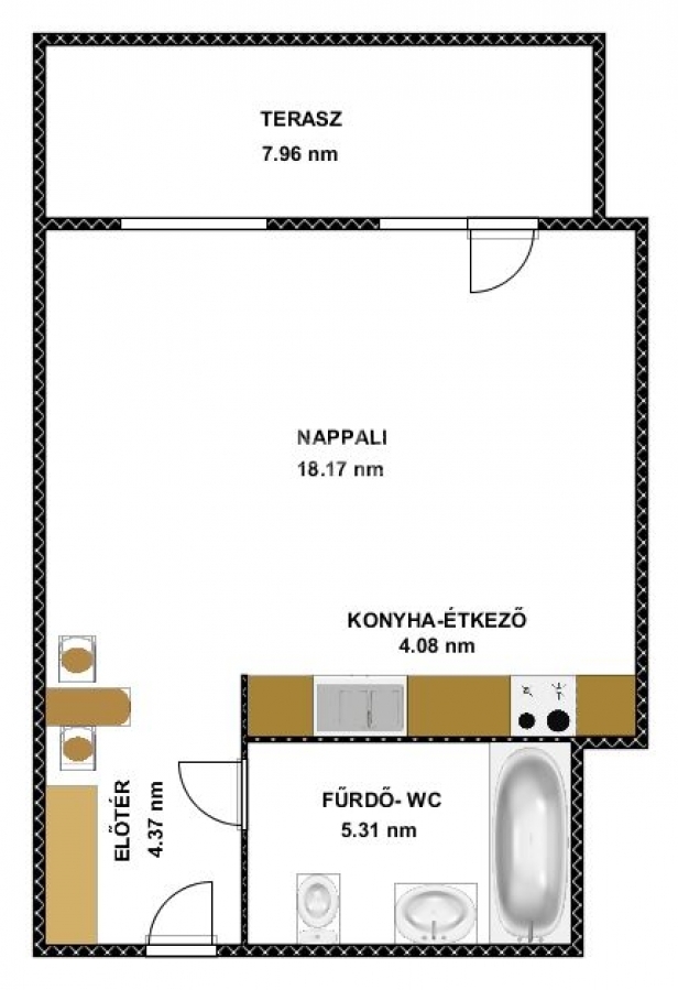 A lakás 1 szobából, konyhából és fürdőszobából áll, valamint rendelkezik egy nagy beépített gardróbszekrénnyel.