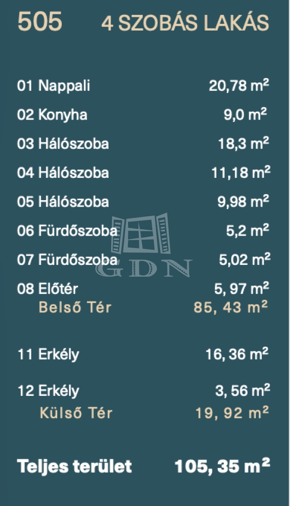 A 6 emeletes társasház 5. emeletén található ez a piacon hiánypótló három hálószobás dupla komfortos, városi panorámás ingatlan. A központi tér a közel 30m2-es konyha -nappali melynek nyugati frontján egy összefüggő üvegfelület, nagy toló ajtókkal határolja a 16m2-es terasztól mely tavasztól, őszig a nappali kiterjesztése. A nyugati benapozásnak köszönhetően napfürdőzhetnek a leendő lakók, az alapterület üvegfelület aránynak köszönhetően pedig télen nyáron nagyon világos, mint egy igazi műterem lakás. A fő háló, mely fürdőszoba kapcsolatos az átgondolt tervezésnek köszönhetően nagyszerűen elkülönül a második, illetve harmadik hálószobától.