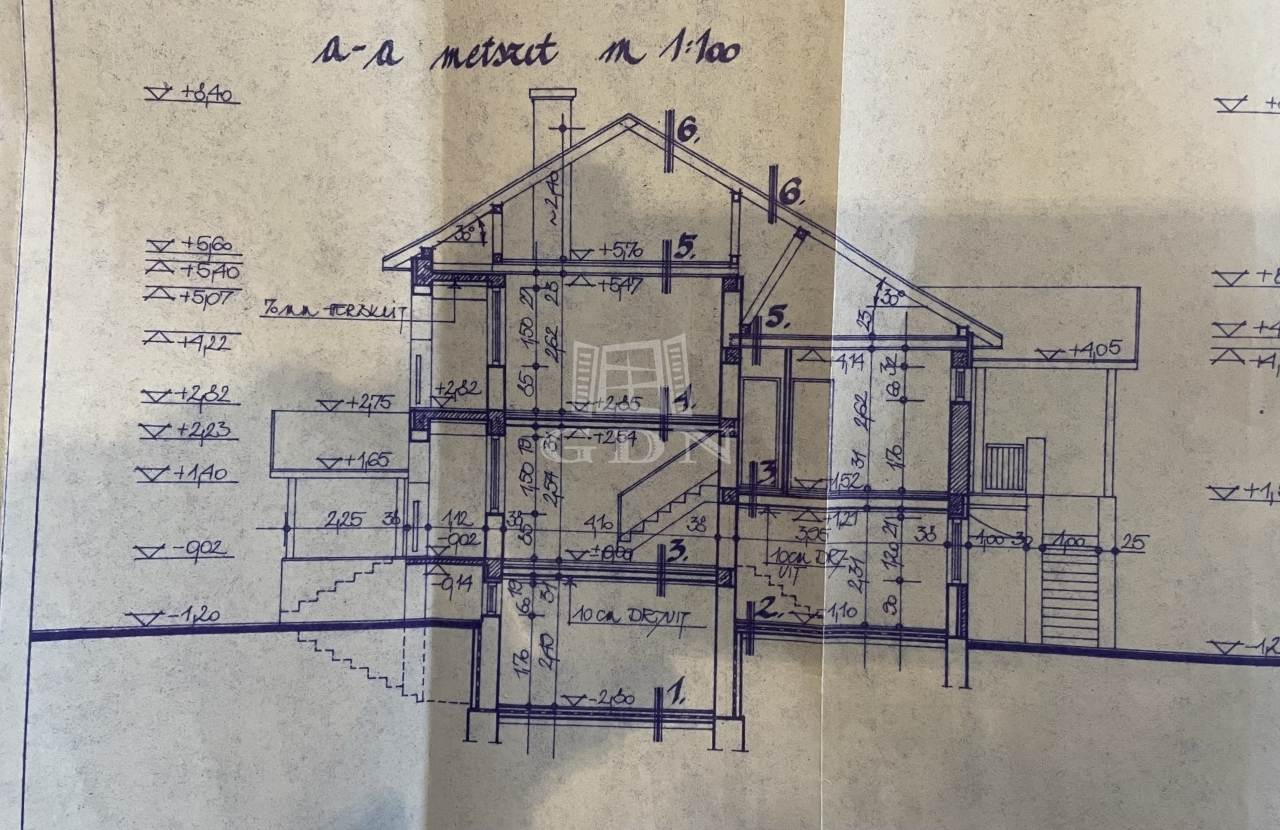 A félszintes eltolásokkal kialakított, öt szintes épületet (bejárat felőli traktus három, hátsó traktus kettő szintes) eredeti tulajdonosa 1991-ben kezdte építeni, a jelenlegi tulajdonos '94-ben módosította, a befejezés pedig 2001-ben történt meg. A ház készültségi állapota 90%-os. A legalsó szint hiányzó munkái (burkolatok, belső festés, és a pincehelyiség végső kialakítása, ahol mosdóhelyiségek is helyet kaphatnak) az új tulajdonosra vár.
