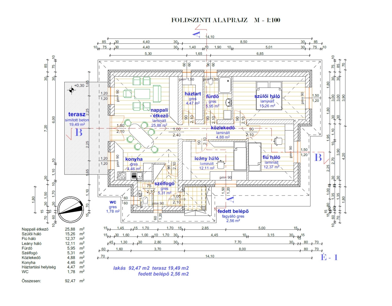 A tető héjazata antracit betoncserép lesz, a homlokzatok 12cm Austrotherm Grafitos EPS, a padló 10cm Austrotherm AT-N100-as, a vízszintes födém 25cm Ásványgyapot szigeteléssel lesz ellátva.