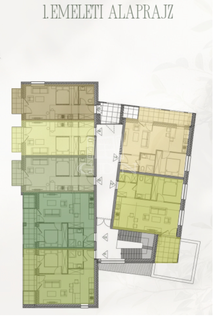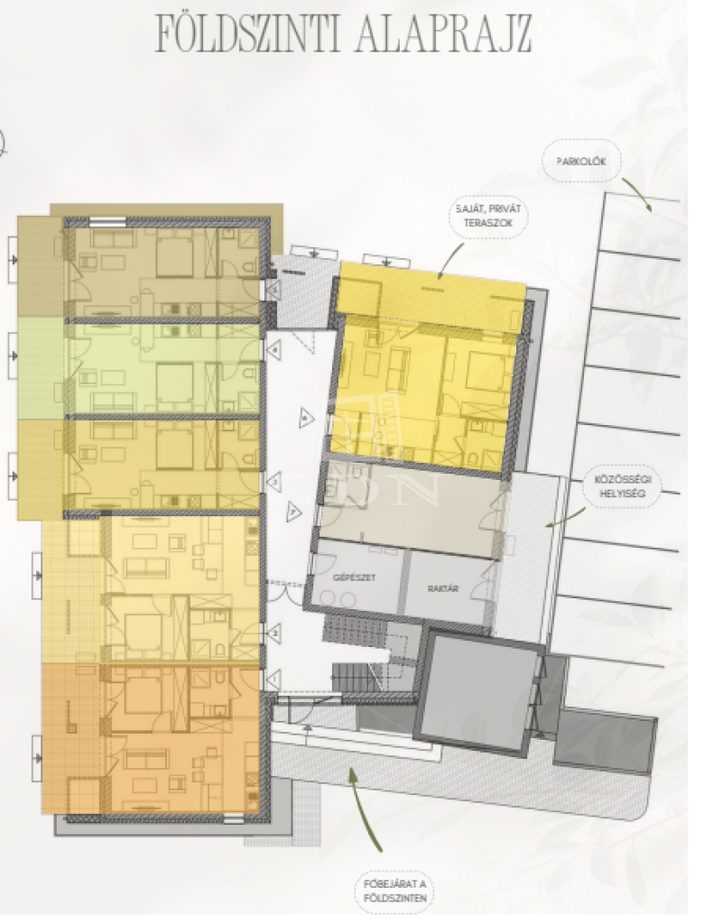 A 3 szintes lakóépület földszintjén, illetve első és második emeletén további lakások helyezkednek el, melyek 29, 30, 39, 40 és 46 m2 alapterületűek.