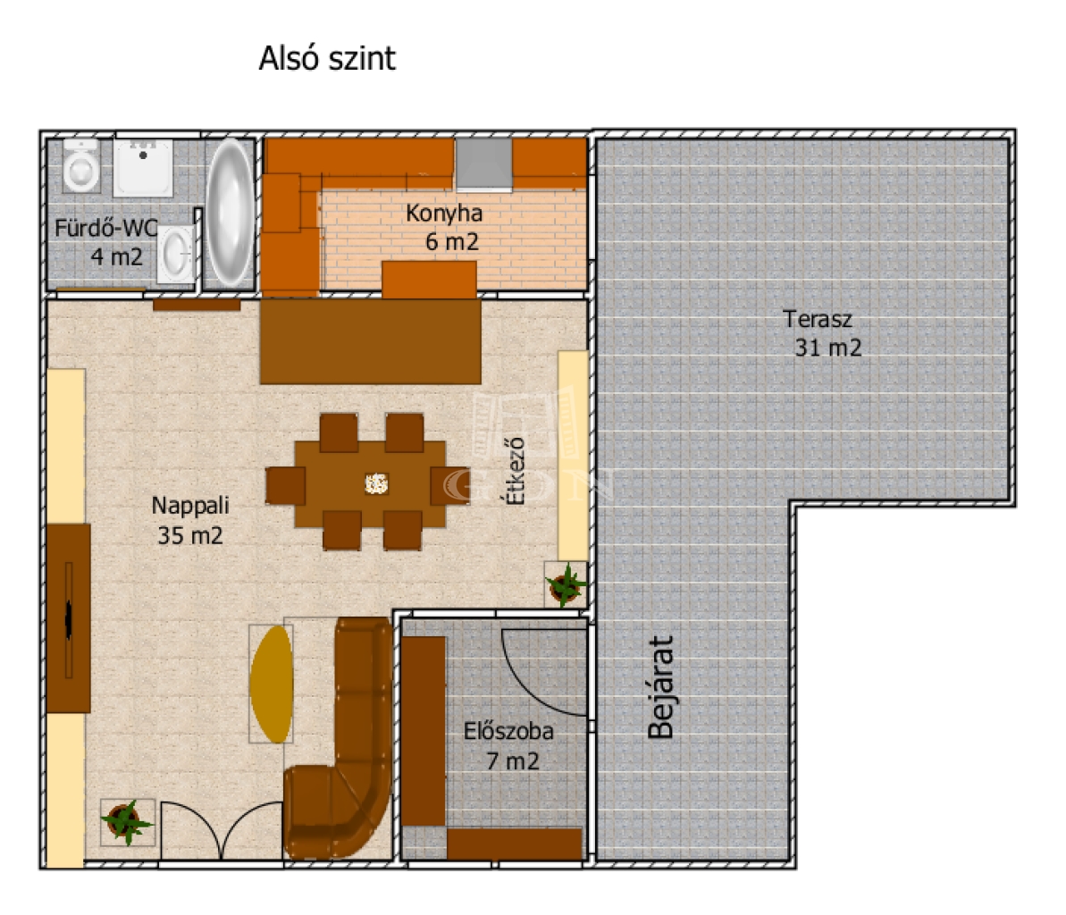 - fürdő-wc (kád+ tusoló - meleg víz ellátás 80L-es bojler)