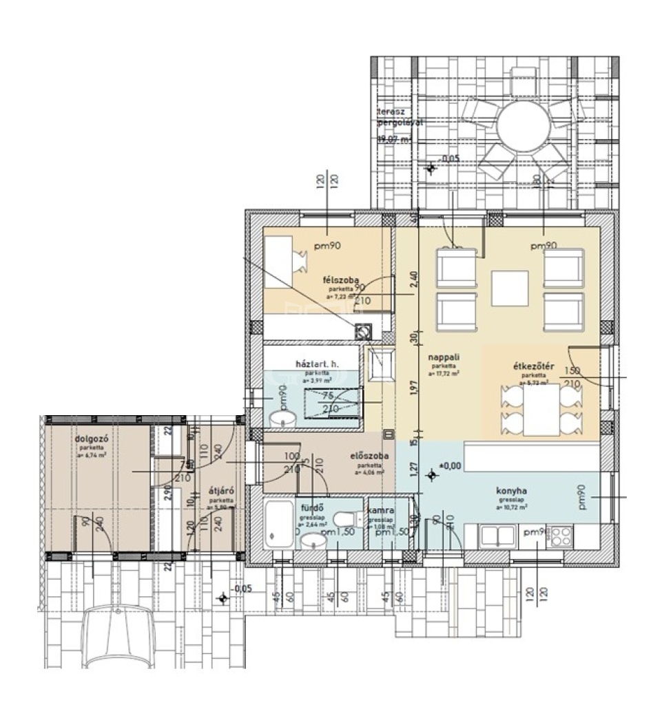 A ház energetikai minősítése: A++ Mindenhol természetes anyagokkal, fa padlóval, tölgyfa konyhabútorral és mészkő burkolattal találkozunk.