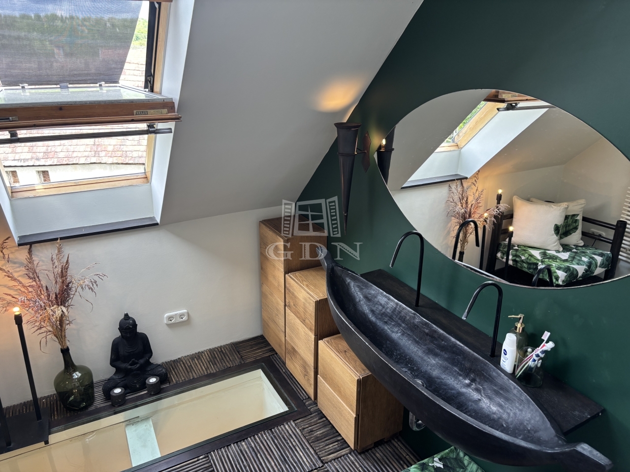 A 180 nm-es ház minden részlete kreativitással és átgondolt megoldásokkal született meg. Az eredeti épület megőrizte hagyományos építészeti értékeit, miközben 2000-ben a mai igényeknek megfelelő modern technikai megoldásokkal került felújításra és átalakításra.