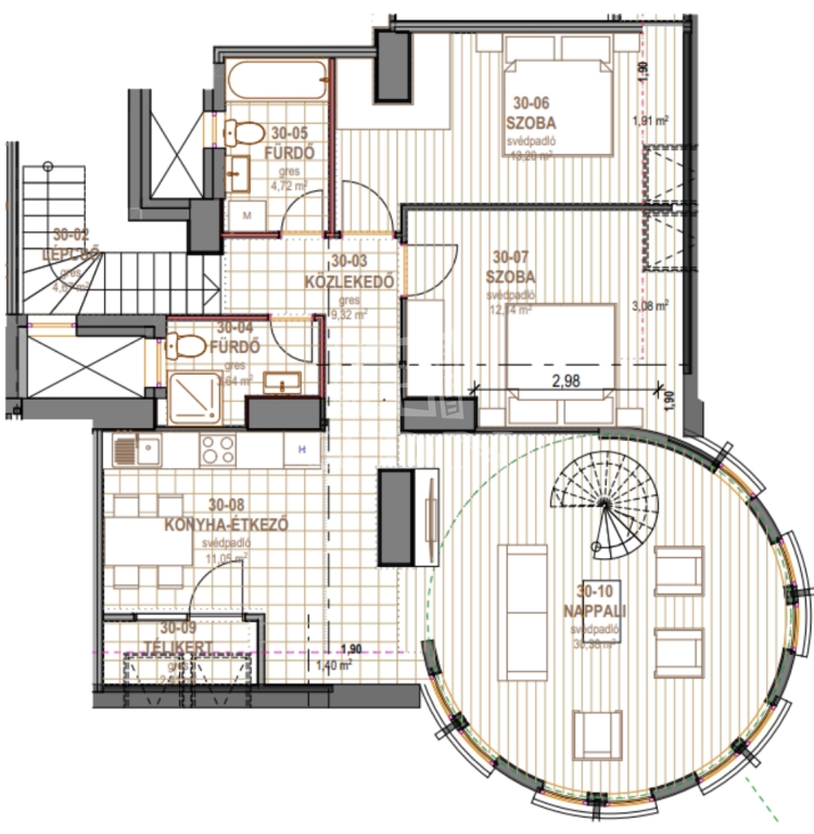 Az enteriőrt személyre szabottan alakítjuk ki, így otthonod megfelel az igényeidnek és kifejezi egyediségedet .Az apartman három hálószobához kétl fürdőszoba tartozik, valamint egy 2,4m2-es loggia is. A pontos beosztás az alaprajzon látható.
