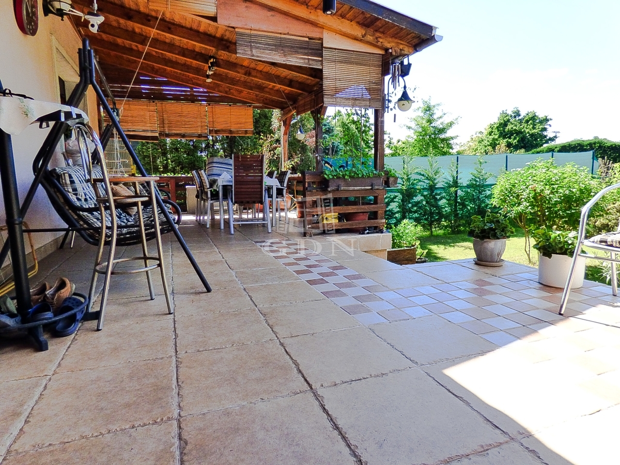 A kert rendezett, öntöző rendszerrel, fúrt és ásott kúttal ellátott, hobby állatoknak kialakított kenellel és egy tárolásra alkalmas 9 nm-es kis faházzal.